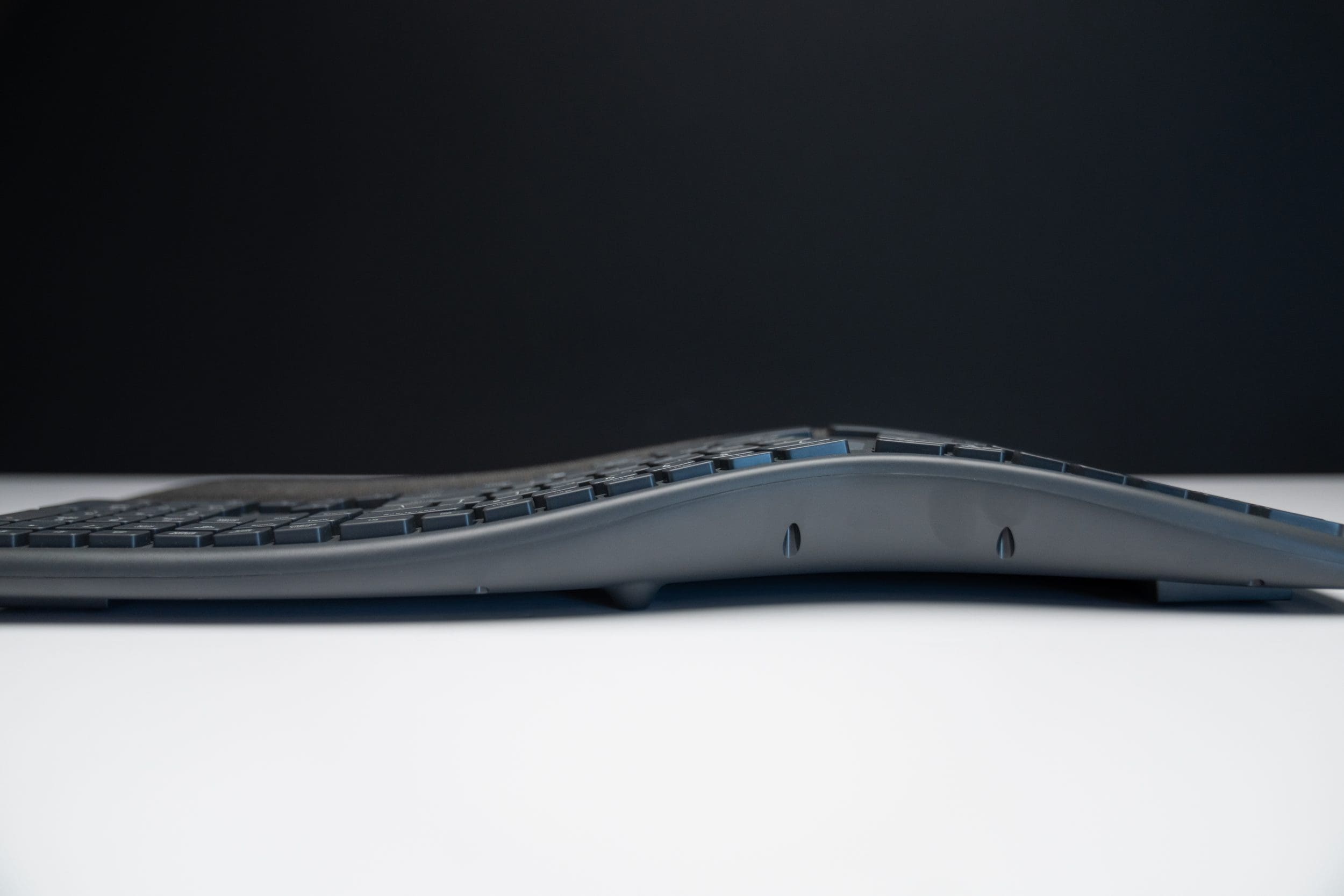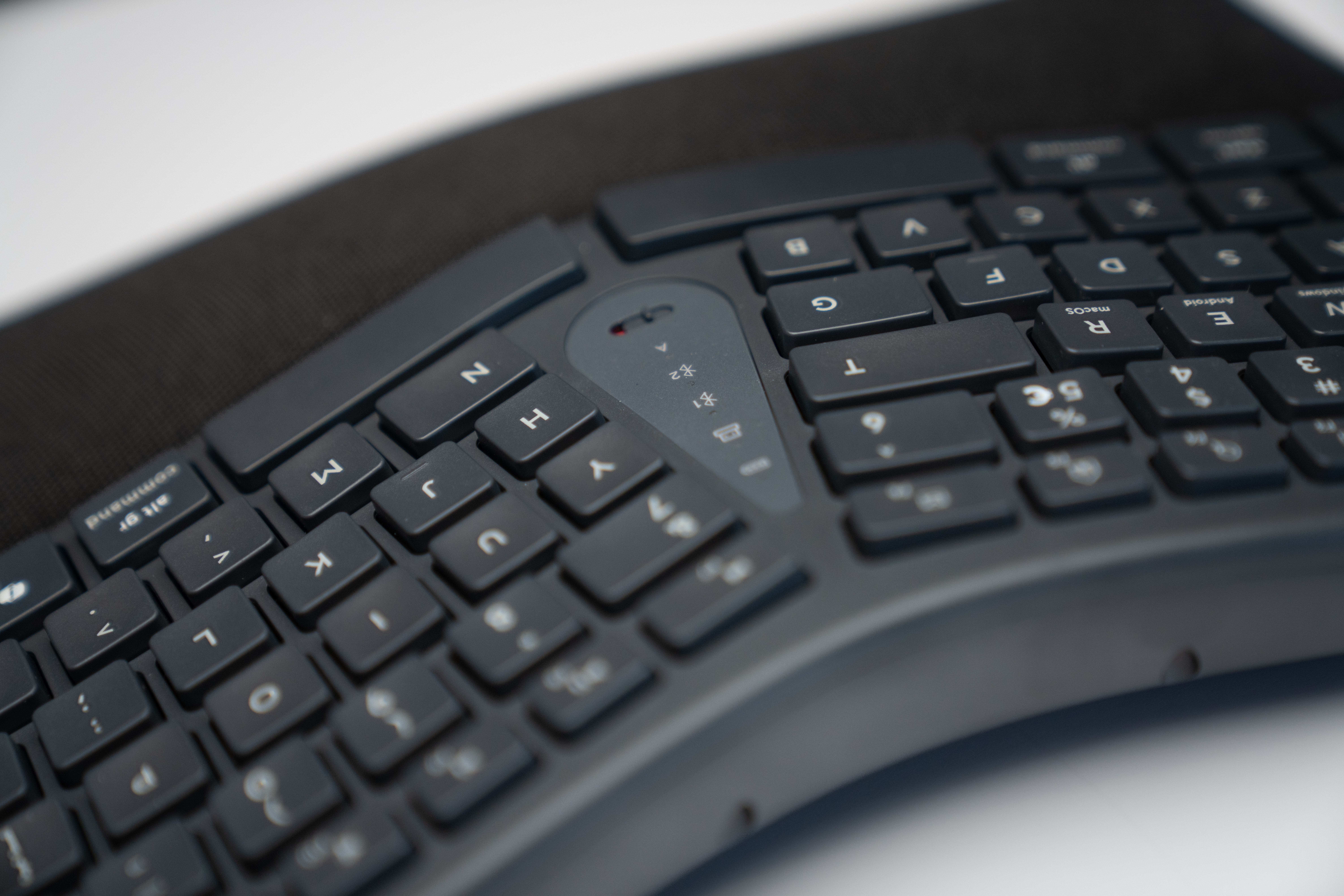 Realitatea, însă, e alta. Deși pernuța este într-adevăr extrem de confortabilă, poziționarea mâinilor pe tastatură și modul în care sunt așezate tastele nu au fost tocmai pe placul meu și mi-a venit foarte greu să o folosesc. De multe ori, tastarea a devenit inconfortabilă și obositoare, iar curba ergonomică a ajuns să fie mai degrabă un obstacol decât un avantaj. După aproape o lună de utilizare intensă pentru scris, pot spune că e o tastatură care mie nu mi-a adus acea ergonomie pe care o așteptam. Și probabil chiar acea curbură ar putea să fie problema. În afară de o zonă ce îți arată la ce device ești conectat, alături și de un buton de ON/OFF, acea despărțire a tastaturii mai tare m-a încurcat. T, G, B, Y, H, N sunt literele distanțate, iar de multe ori m-am trezit că-mi doream ca T-ul să fie pe dreapta, iar N-ul pe stânga.