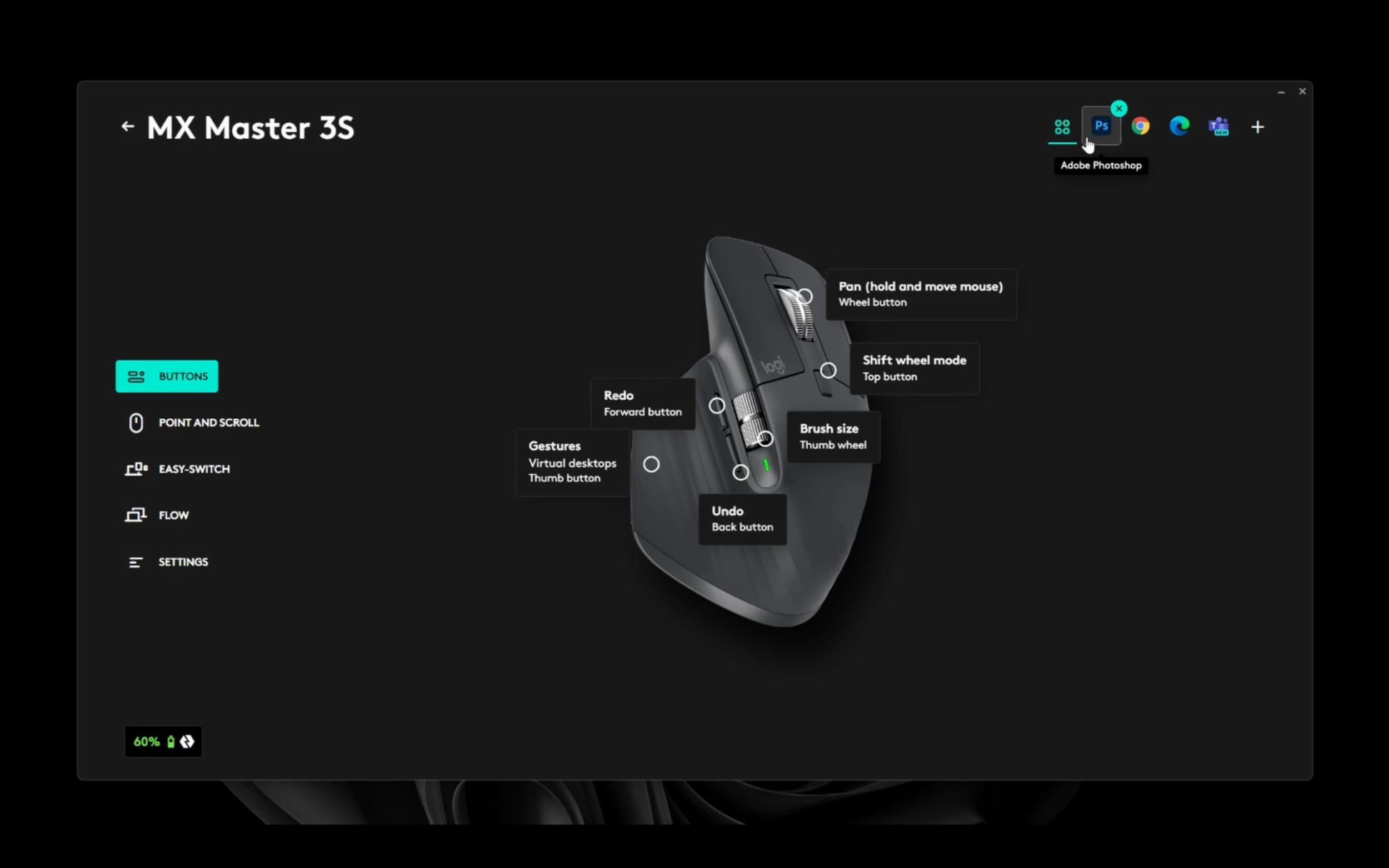 Aplicația ne permite să modificăm o mulțime de parametri. În cazul lui MX Master 3S putem alege diferite profiluri care modifică ce fac butoanele raportat la aplicația pe care o folosim. Există câteva prestabilite și suport oficial pentru aplicațiile din suita Adobe, de exemplu, pentru browser-e precum Chrome sau Edge, sau Microsoft Teams, însă poți selecta orice aplicație instalată de tine în PC și poți configura mouse-ul să se poarte diferit în aceasta.
