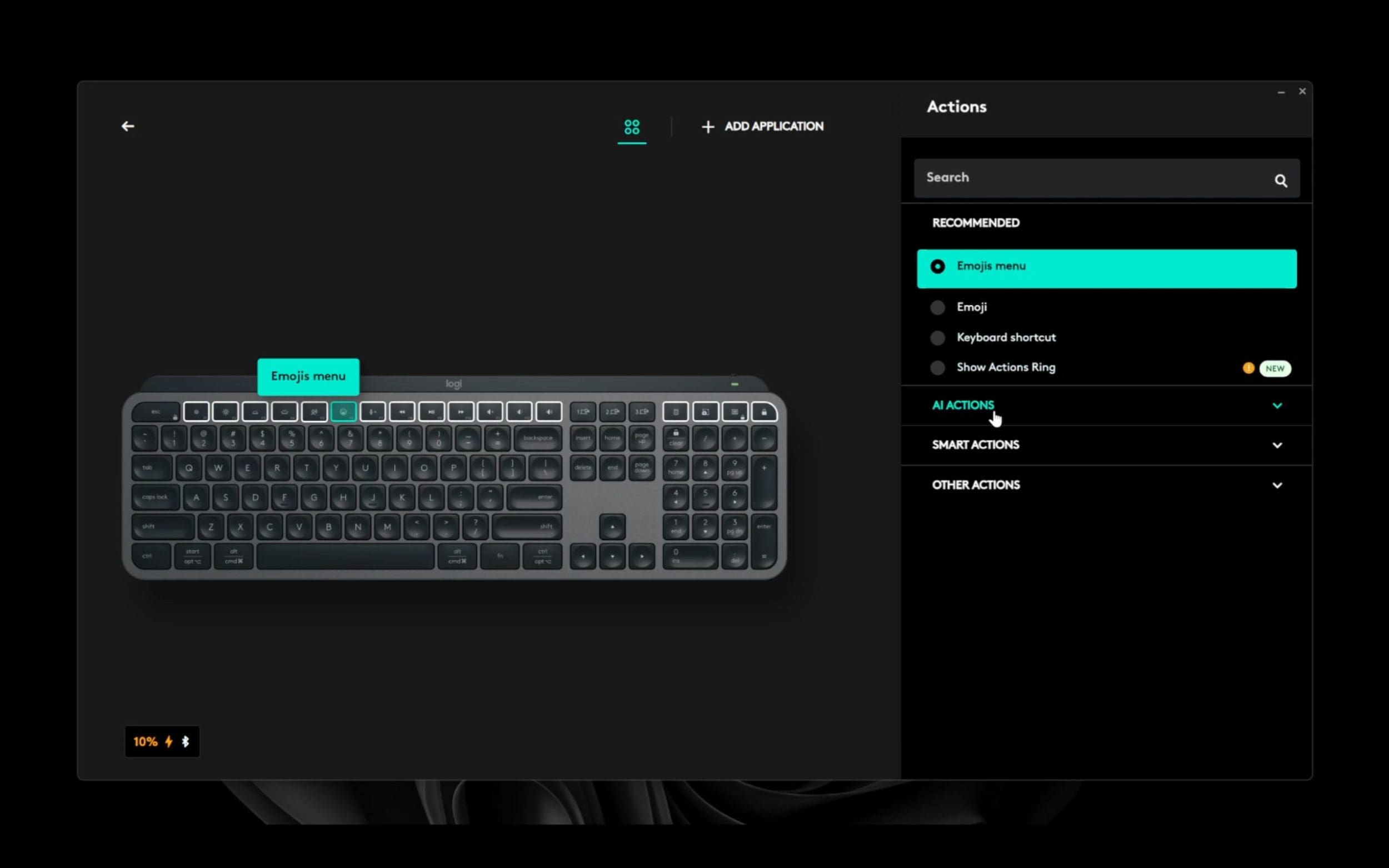 Altă funcție interesantă pe care o introduce aplicația Logi Options+ vine sub forma unui meniu de comenzi rapide care poate fi assignat pe orice buton. Odată apăsat acest „Actions Ring”, pe ecran va apărea o roată cu scurtături: avem File Explorer, meniul de emoji, scurtătură pentru Snipping Tool ca să faci screenshot-uri mai ușor, dar și un submeniu cu scurtături către cei mai populari boți AI de pe piață. Și acest meniu este complet personalizabil, oferind mai multe pagini, opțiuni per-aplicație și multe alte opțiuni de configurare.