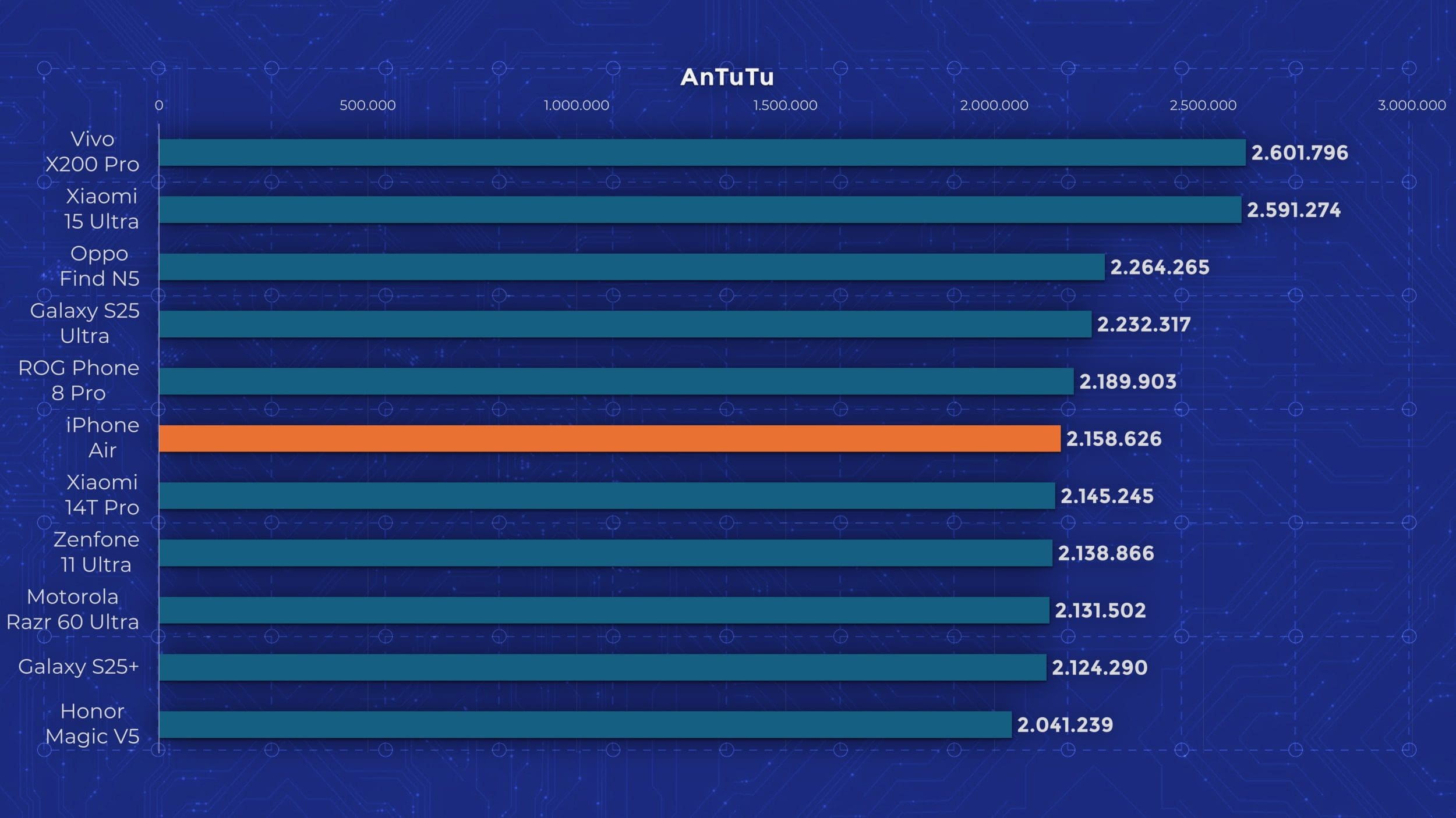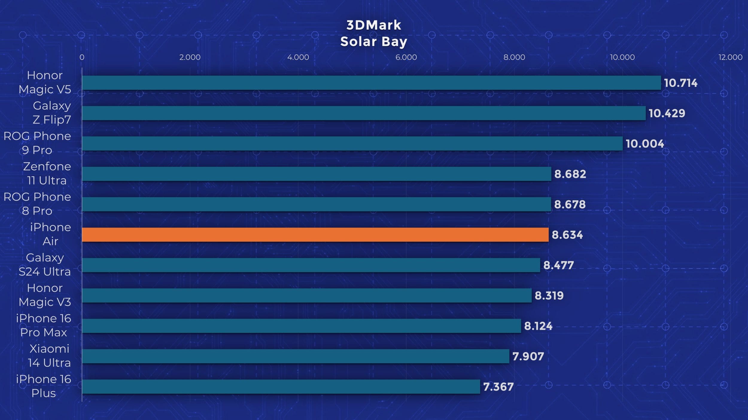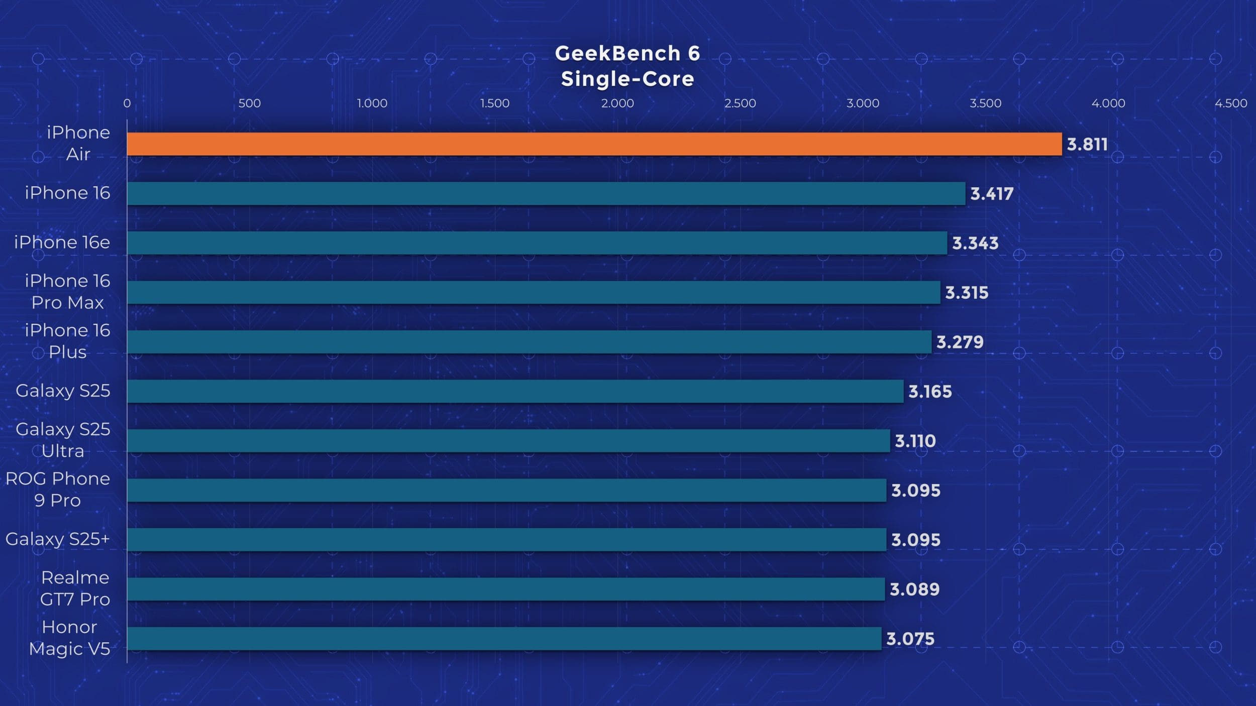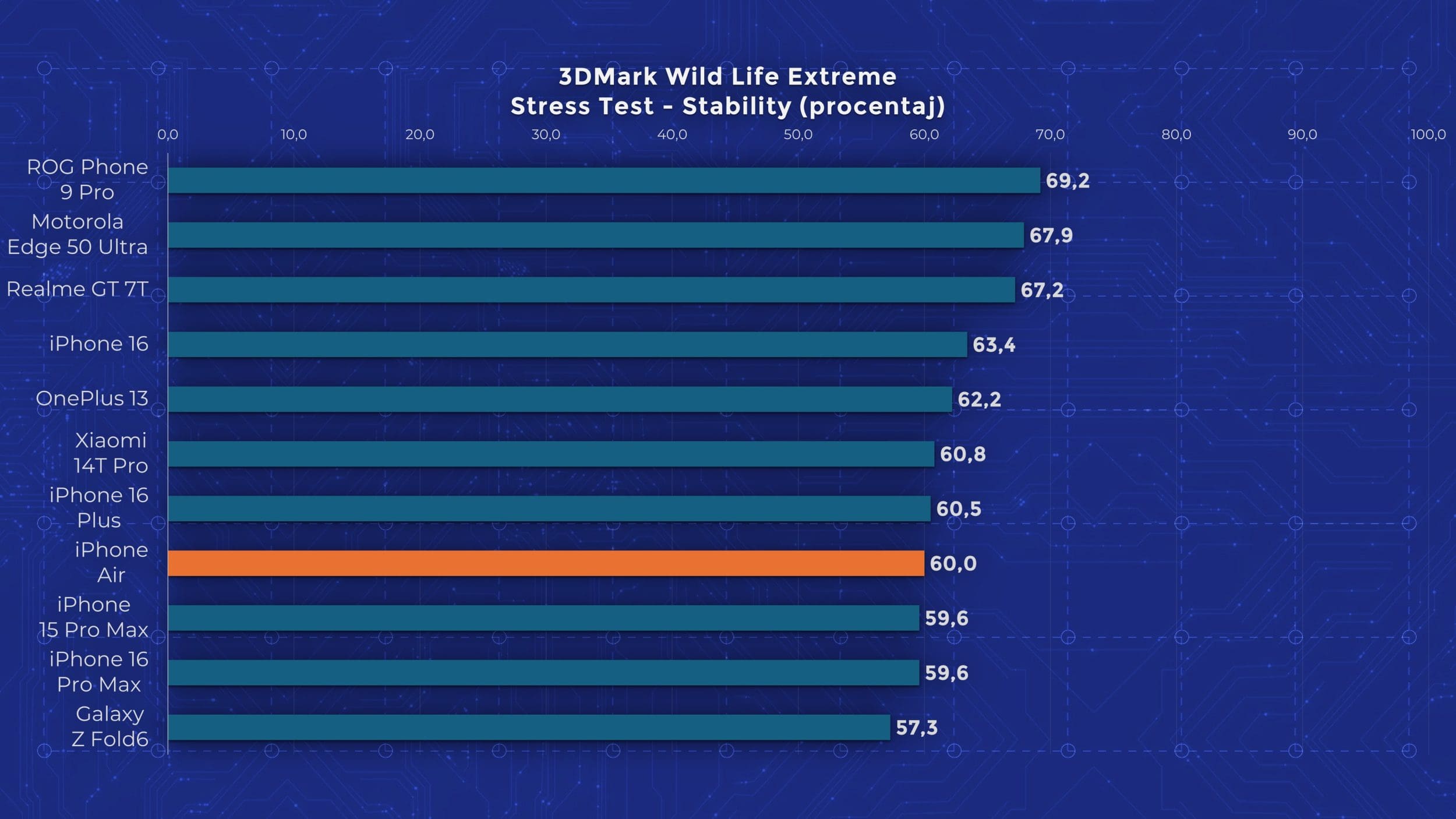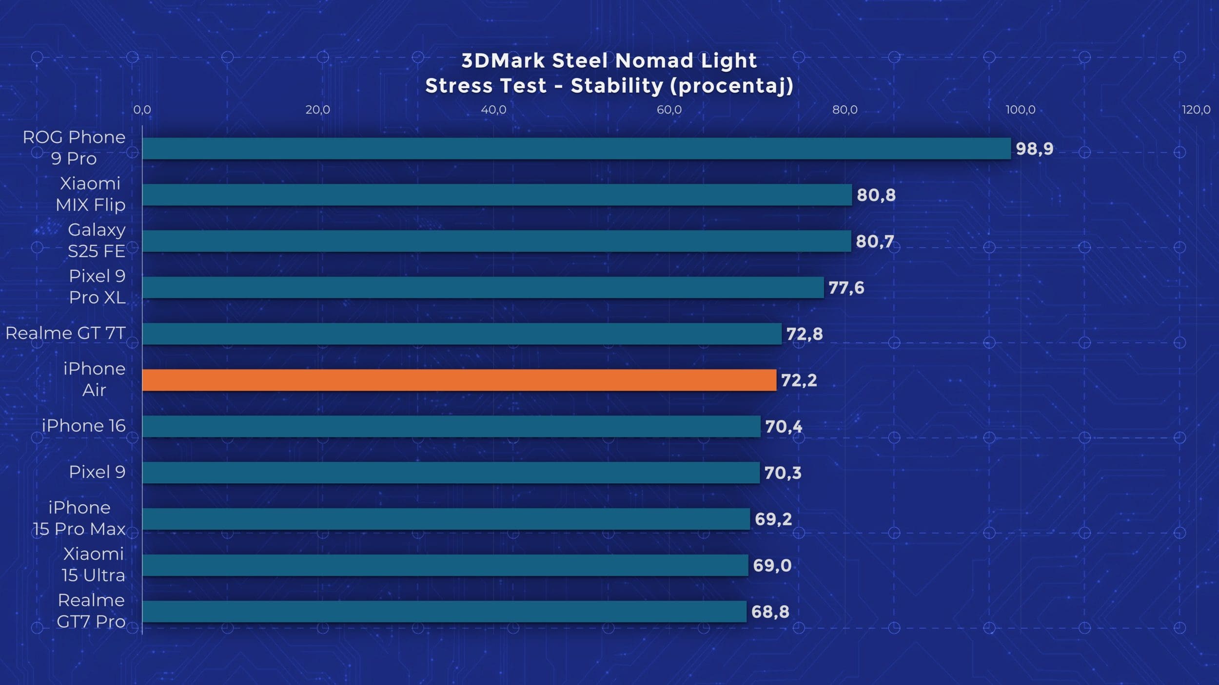 iPhone Air este sus în rezultate din testele GeekBench, se poziționează printre alte flagship-uri recente în majoritatea testelor CPU, și obține doar scoruri din zona iPhone 16 la capitolul GPU, pentru că vine fără un nucleu. Totuși, în ciuda spațiului mic de la interior, titanului de pe margini și lipsei răcirii, stabilitatea în testele de stres este impresionantă: peste 60%, chiar peste 70% în anumite cazuri. Vedem clar că procesorul nu poate să tragă la putere maximă, dar oferă totuși performanță de flagship.