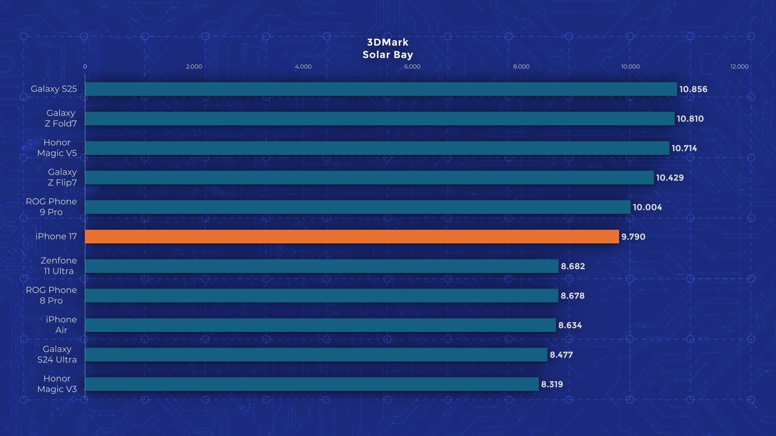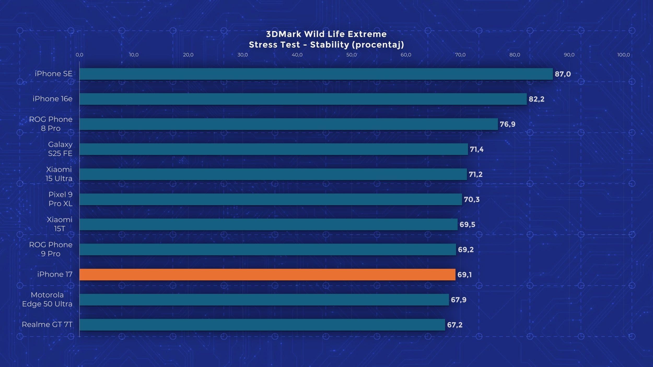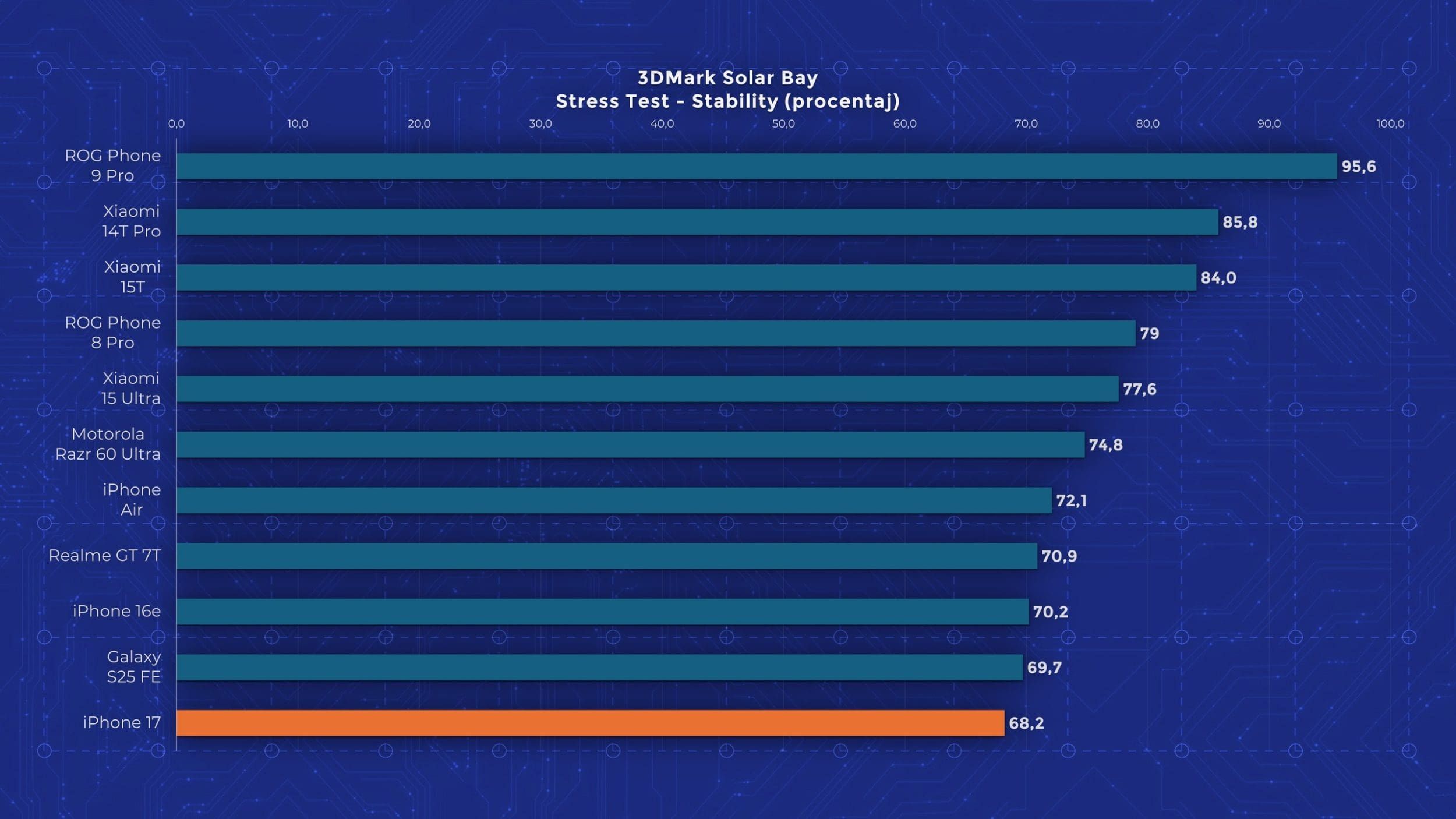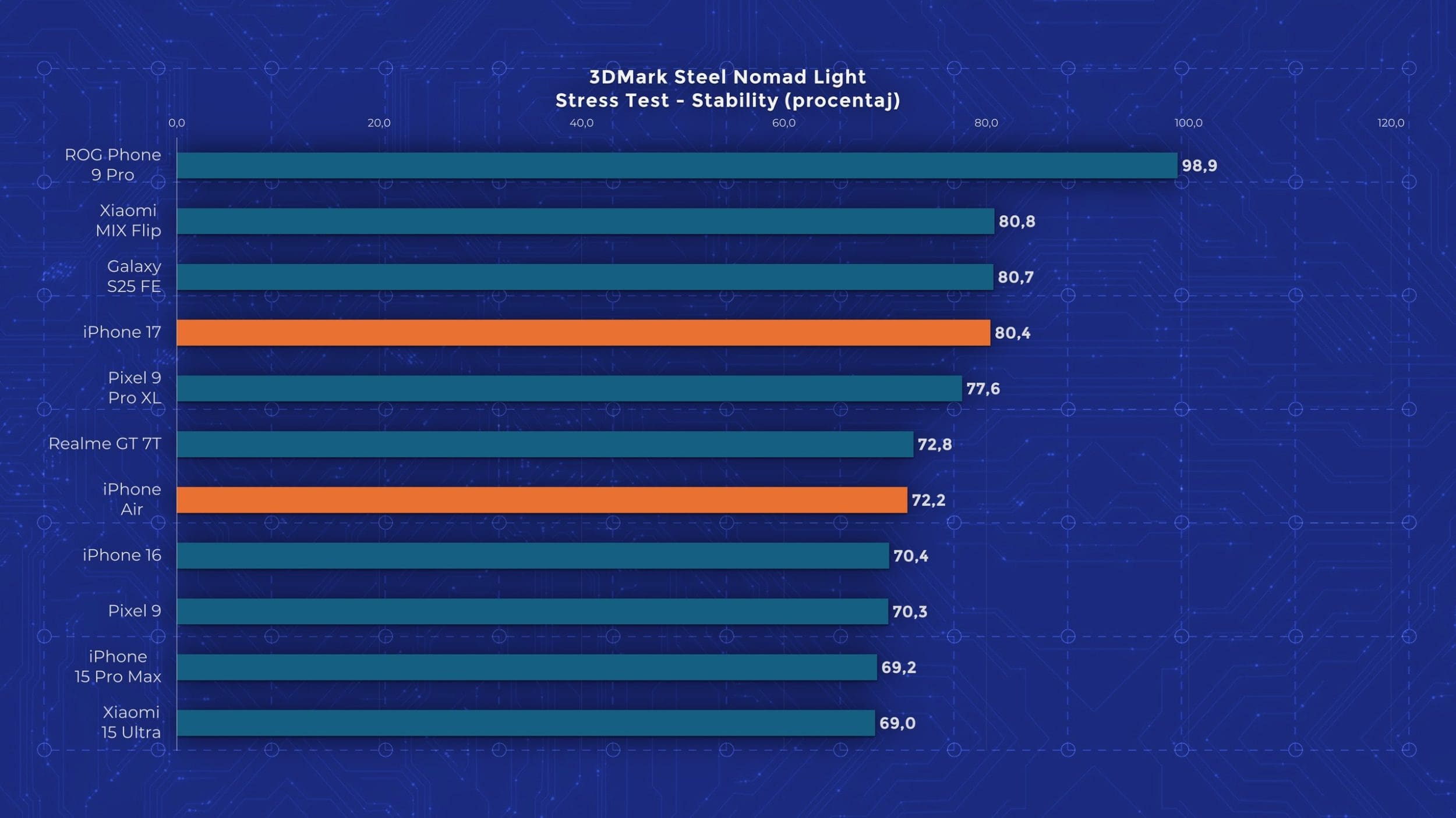 M-am bucurat să văd că rezultatele în teste sunt foarte apropiate de A19 Pro de pe Air, chiar puțin peste, iar stabilitatea în testele de stres este bună, pe la 70, chiar 80%. O să vă dau un mic spoiler: este chiar mai stabil decât 17 Pro, care include o cameră cu vapori pentru răcire.