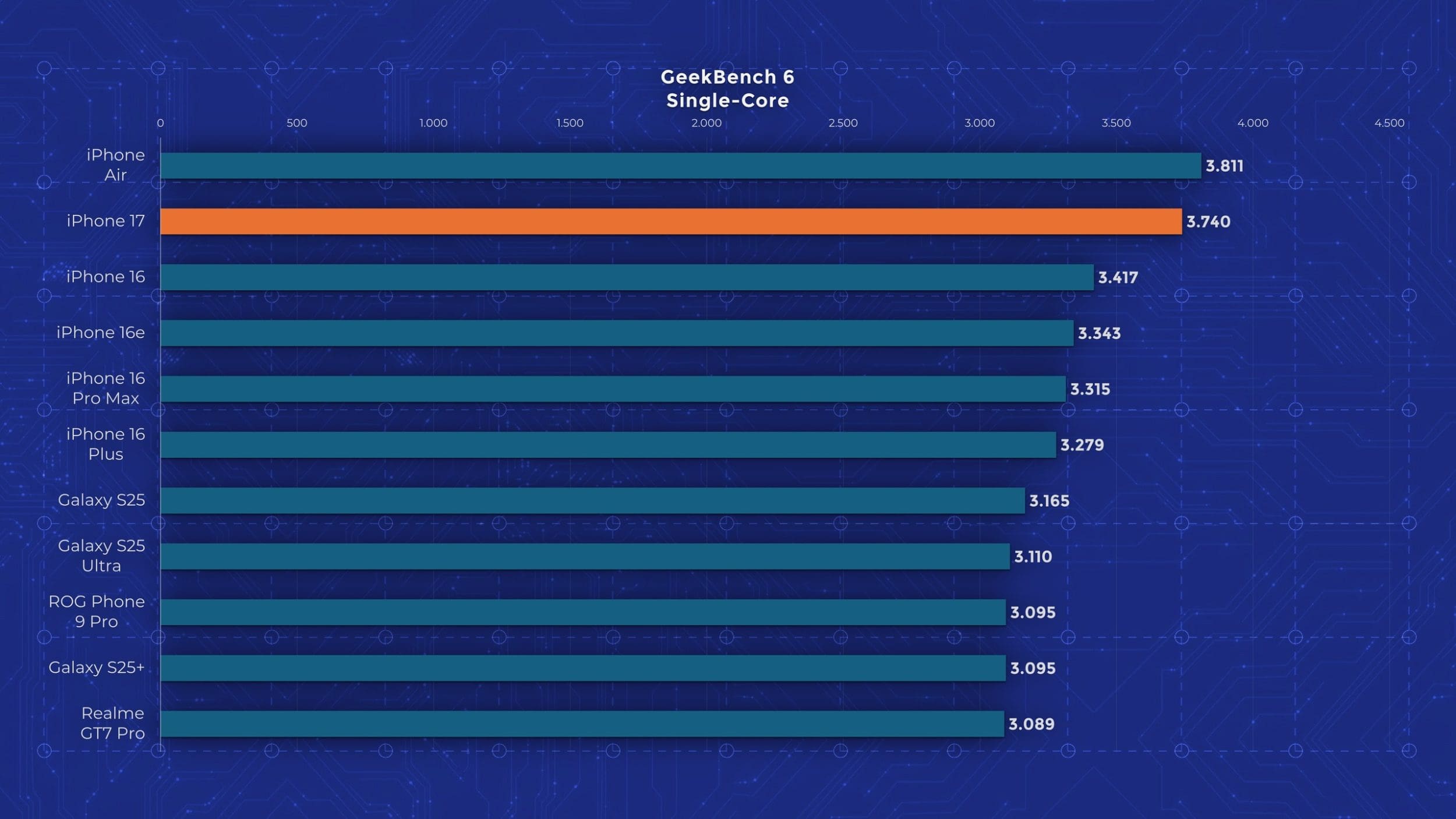 La nivel de performanță avem parte de o altă surpriză. Deși are un procesor A19, nu A19 Pro, acesta nu este semnificativ mai slab în testele de performanță. Are același CPU și același GPU de pe iPhone Air, însă scade de la 12 la 8 GB memorie RAM. În utilizare normală pot confirma că nu se simte nicio diferență, însă s-ar putea ca în timp, dacă folosești multe aplicații în paralel să observi că unele intră în stand-by și se repornesc atunci când te întorci la ele. Este posibil să vedem în timp și o limitare pe partea de AI, întrucât anumite funcții ar putea veni doar pe Pro-uri, pentru că au mai multă memorie. Mai e mult până departe însă, întrucât Apple are de recuperat mult în acest domeniu.