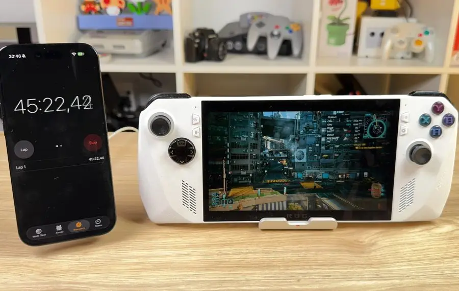 Pentru a testa bateria am folosit Cyberpunk 2077, în continuare unul dintre cele mai pretențioase jocuri de PC. Am folosit aceeași salvare pentru a testa autonomia iar rezultatele sunt destul de clare. Pe bateria originală de 40 Wh, ROG Ally pe profilul Turbo ține doar 45 de minute, ceea ce sugerează că degradarea bateriei în acești doi ani a fost minimă sau chiar inexistentă, întrucât cam atât ținea și când era nouă. Pe noua baterie de 80 Wh, am obținut o oră și 56 de minute, deci avem autonomie mai mult decât dublă, un aport de aproape 150%. Acesta este însă cel mai extrem caz, adevărata autonomie pe baterie va fi pe profilurile performance sau silent, la care apelezi în funcție de joc și setările dorite.