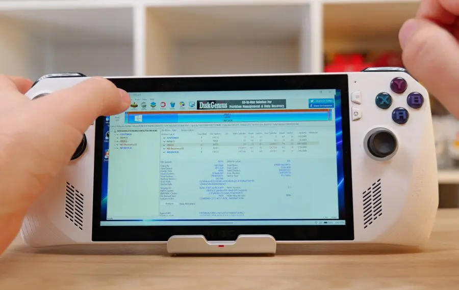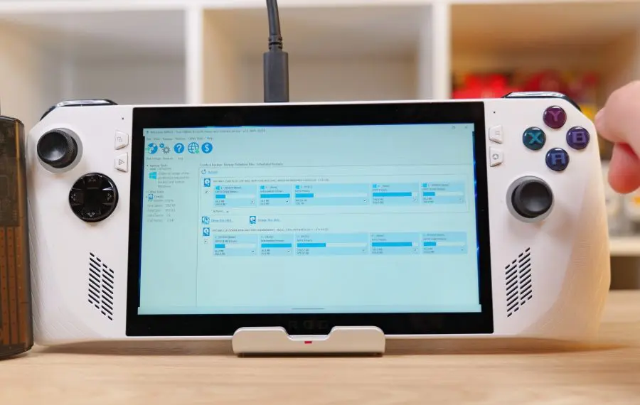 Am făcut upgrade-uri simultan, întrucât nu vreau să deschid consola de prea multe ori. Upgrade-ul de SSD este extrem de simplu, însă necesită puțină pregătire înainte, întrucât nu am vrut să pierd ce am deja pe SSD-ul original. Astfel, mai întâi am realizat o clonă a SSD-ului original, pe care am scris-o direct pe SSD-ul Kingston. Pentru asta am folosit un dock pentru SSD-uri M.2 pe USB care este opțional. Se poate face clonarea și prin intermediul unui PC cu două slot-uri M.2. Eu am folosit Macrium Reflect 7, o aplicație gratuită, pe care am instalat-o direct pe Ally, am rulat procesul de clonare și am așteptat aproximativ 20 de minute. Procesul este destul simplu și intuitiv, dar nu face o clonă directă a SSD-ului original, lăsând cam 1,3 TB de spațiu liber. Folosind DiskGenius am făcut și o redimensionare a partiției de sistem, pentru a accesa tot spațiul de pe SSD.