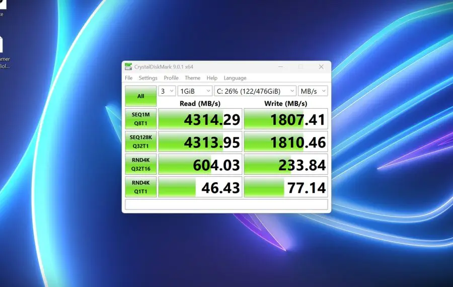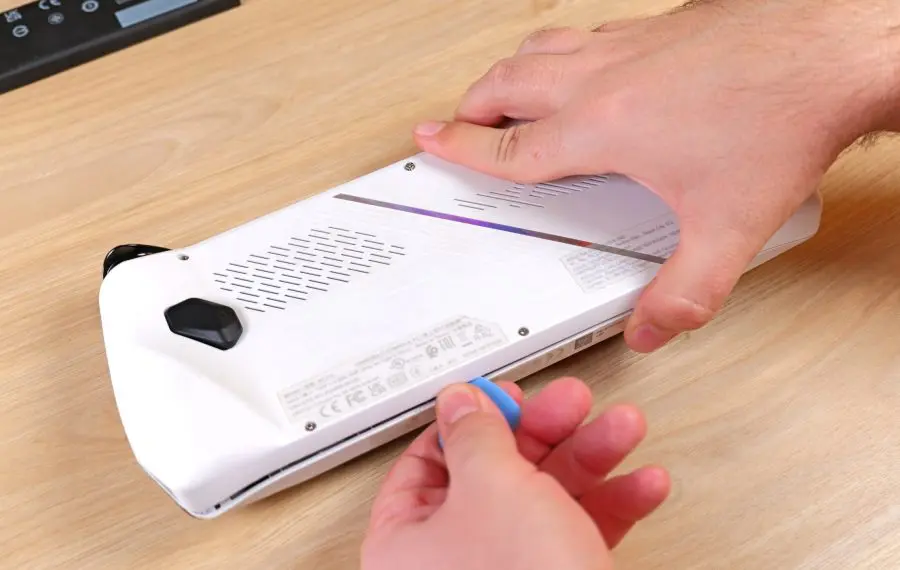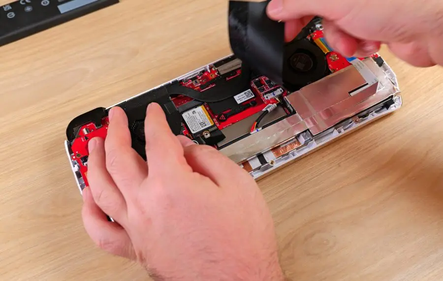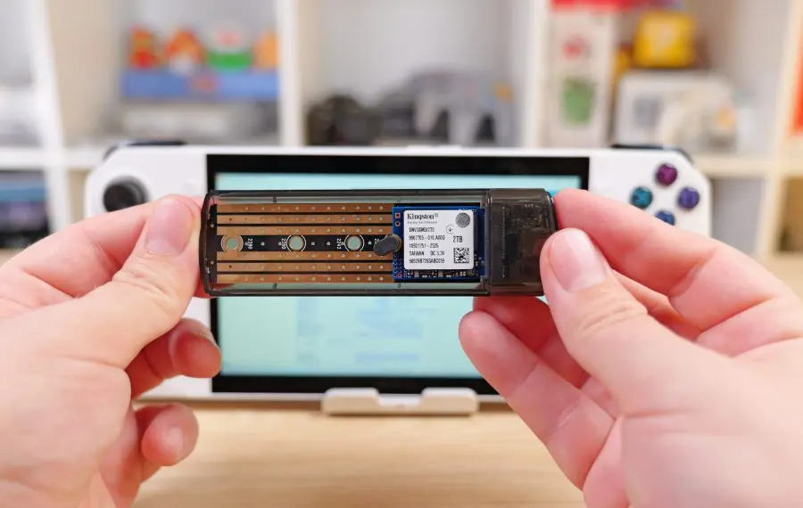 Acum că avem SSD-ul pregătit, ajungem la partea de modificări hardware. Pentru a desface Ally-ul, nu trebuie decât să scoți cele 6 șuruburi de pe spate și să folosești o pană de chitară pentru a separa cele două jumătăți. Durează cu totul vreo 2-3 minute. SSD-ul este acoperit de o protecție din plastic, pe care o poți înlătura pentru a desface șurubul. Tot ce trebuie să faci este să pui SSD-ul clonat în consolă și cam acesta este upgrade-ul de stocare. Dacă modelul original de Ally venea cu un SSD mai lent, cu 4,3 GB la citire și 1,8 GB la scriere, cel Kingston atinge 6,3 GB la citire și 5,7 GB la scriere, depășind specificațiile promise de producător. Nu vei simți asta în jocuri obligatoriu, ci mai degrabă în transferuri de jocuri de pe alte dispozitive. Vei simți însă cei 1,5 TB de stocare în plus, care vor ține mult mai multe jocuri.