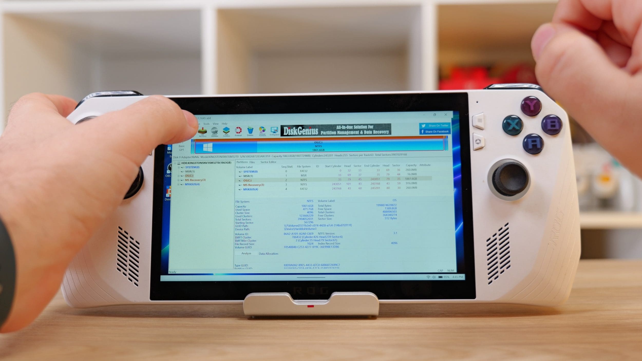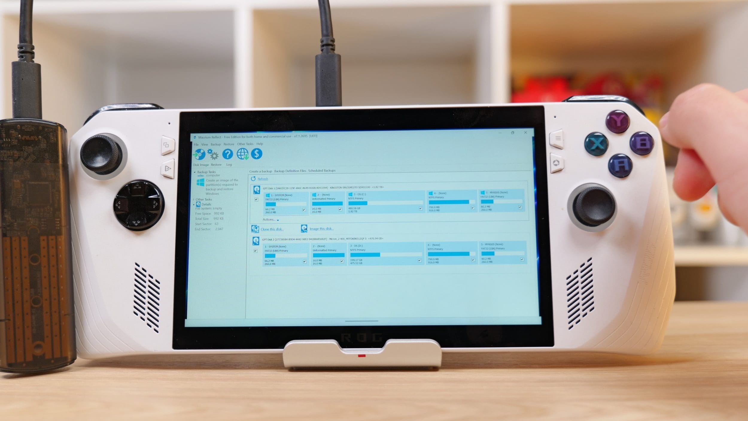 Am făcut upgrade-uri simultan, întrucât nu vreau să deschid consola de prea multe ori. Upgrade-ul de SSD este extrem de simplu, însă necesită puțină pregătire înainte, întrucât nu am vrut să pierd ce am deja pe SSD-ul original. Astfel, mai întâi am realizat o clonă a SSD-ului original, pe care am scris-o direct pe SSD-ul Kingston. Pentru asta am folosit un dock pentru SSD-uri M.2 pe USB care este opțional. Se poate face clonarea și prin intermediul unui PC cu două slot-uri M.2. Eu am folosit Macrium Reflect 7, o aplicație gratuită, pe care am instalat-o direct pe Ally, am rulat procesul de clonare și am așteptat aproximativ 20 de minute. Procesul este destul simplu și intuitiv, dar nu face o clonă directă a SSD-ului original, lăsând cam 1,3 TB de spațiu liber. Folosind DiskGenius am făcut și o redimensionare a partiției de sistem, pentru a accesa tot spațiul de pe SSD.