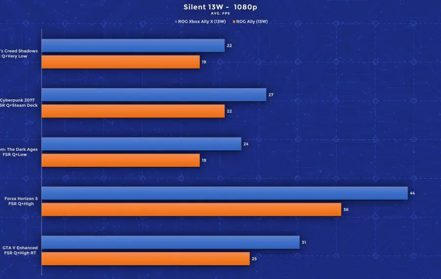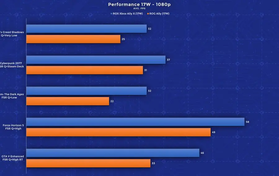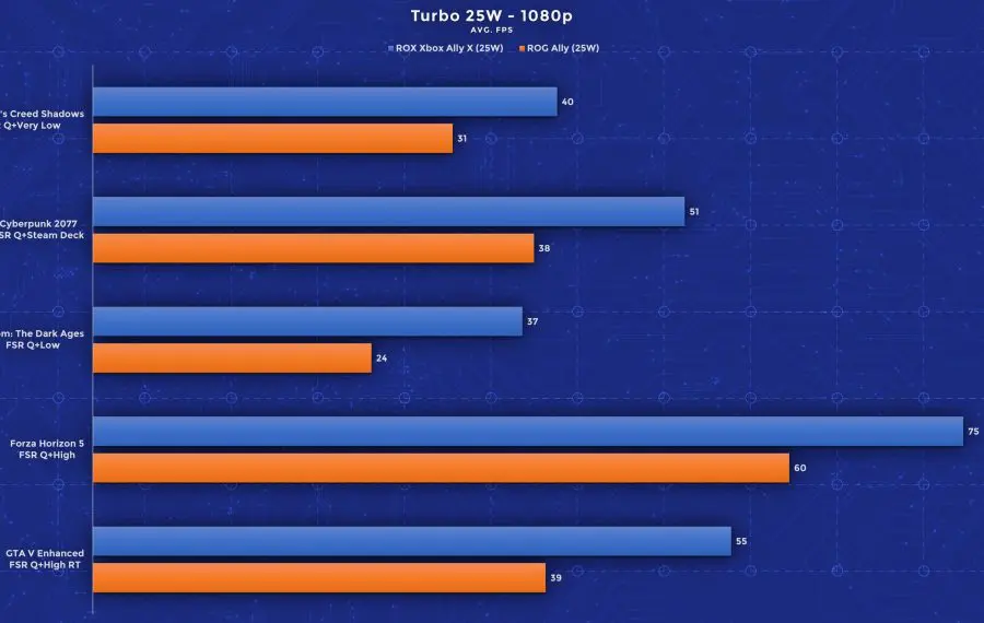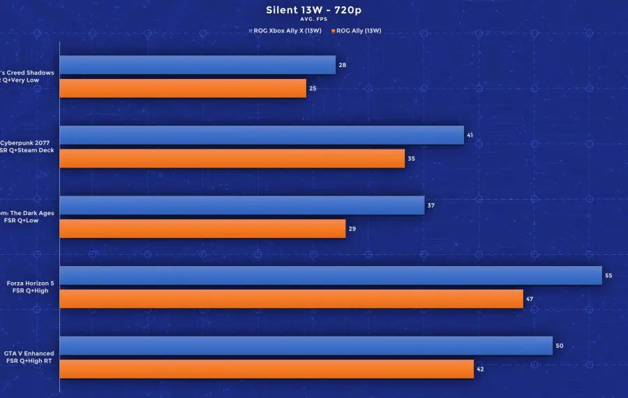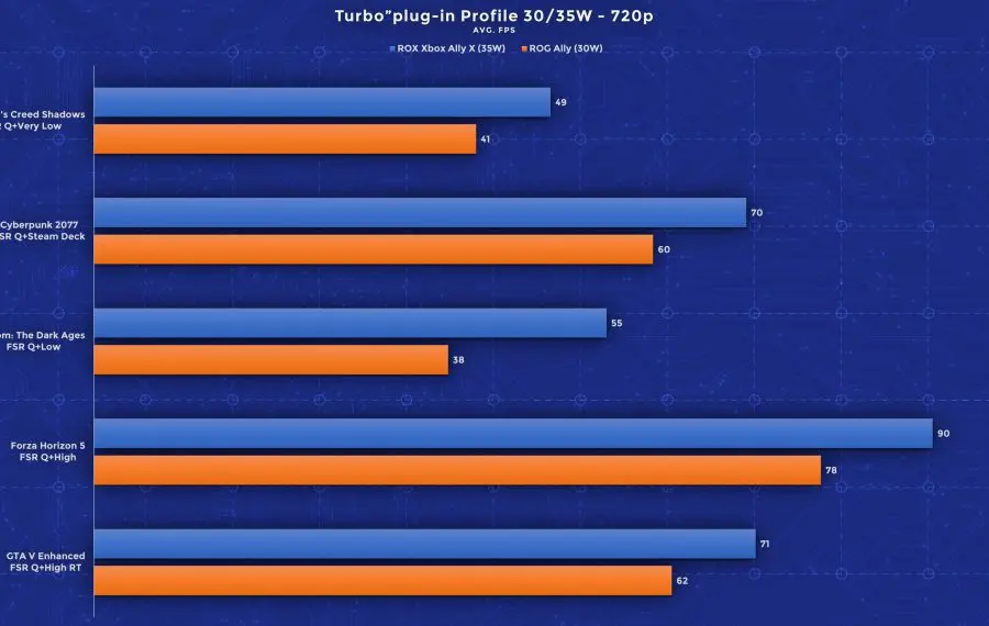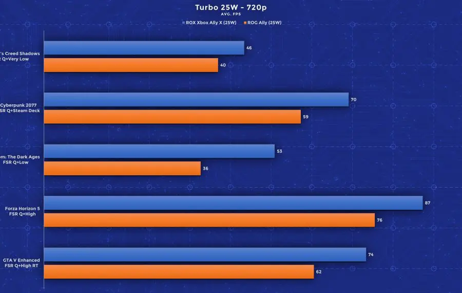 Am rulat teste folosind jocuri precum Assassin’s Creed: Shadows, Cyberpunk 2077, Doom: The Dark Ages, Forza Horizon 5 și GTA V, iar rezultatele sunt impresionante. Deși ecranul este unul 1080p, în urma testelor, recomand totuși utilizarea rezoluției 720p cu setări grafice mai înalte pentru framerate-uri mai mari. Pentru consistență, am folosit aceleași profiluri de performanță pe ambele rezoluții și am rulat toate testele cu FSR activ pe profilul Quality. Jocurile mai pretențioase precum Assassin’s Creed și Doom au rulat pe Low (între timp Doom a primit și un update care adaugă un nou profil dedicat dispozitivelor handheld). Celelalte jocuri au performat bine chiar și pe setări High, iar în GTA am fost surprins că rulează bine chiar și cu toate opțiunile ray tracing active. Important este că aceste rezultate de mai jos valabile pentru setările alese de mine. Folosind profiluri mai joase de calitate și upscaling mai agresiv, poți atinge performanță și mai bună în aceste titluri. Din testele mele, acestea oferă însă un balans bun între calitate și performanță.