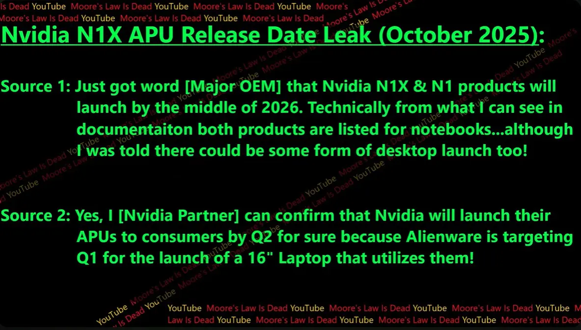 Nvidia N1X a fost amânat acum până în 2026. Una dintre sursele dintre producătorii OEM susține că produsele Nvidia N1X și N1 vor fi lansate până la mijlocul anului 2026. Se pare că aceste APU-uri sunt destinate laptopurilor cu Windows și există posibilitatea ca Nvidia să lanseze și APU-uri pentru desktop-uri.