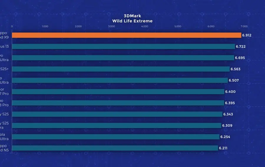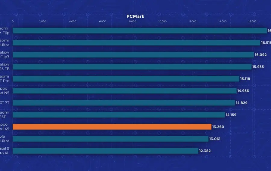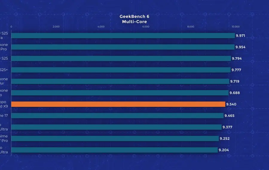 O altă caracteristică de flagship penru Oppo Find X9 este procesorul. Acest model este primul care integrează Dimensity 9500, noul chipset flagship de la MediaTek. Este mai puternic cu vreo 30%, oferă performanță dublă în sarcini AI și ar trebui să crească eficiența energetică cu vreo 40% față de generația anterioară. În utilizare normală, așa cum era de așteptat, cipul se descurcă excelent. Este performant, dar nu cel mai performant din piață. În teste rezultatele sunt peste Dimensity 9400, pe la nivelul Snapdragon 8 Elite și Apple A18 Pro.