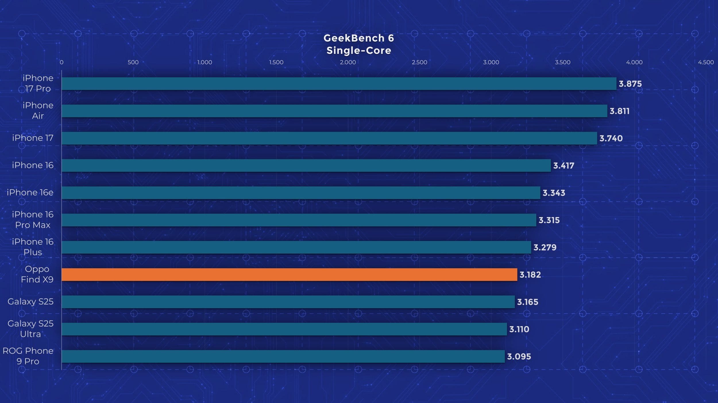 O altă caracteristică de flagship penru Oppo Find X9 este procesorul. Acest model este primul care integrează Dimensity 9500, noul chipset flagship de la MediaTek. Este mai puternic cu vreo 30%, oferă performanță dublă în sarcini AI și ar trebui să crească eficiența energetică cu vreo 40% față de generația anterioară. În utilizare normală, așa cum era de așteptat, cipul se descurcă excelent. Este performant, dar nu cel mai performant din piață. În teste rezultatele sunt peste Dimensity 9400, pe la nivelul Snapdragon 8 Elite și Apple A18 Pro.