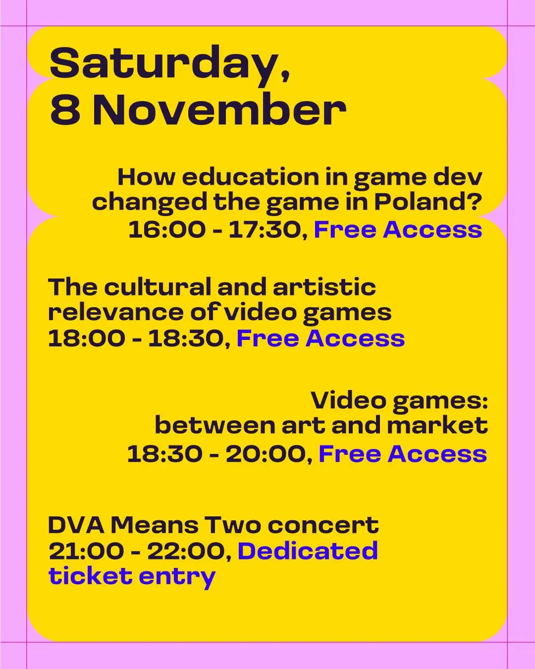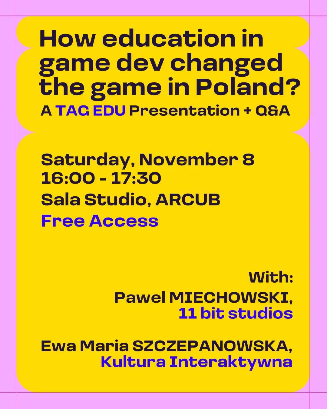Weekendul de deschidere (8–9 noiembrie) propune o serie de evenimente ce reunesc nume importante din domeniu. Sâmbătă, 8 noiembrie, programul începe la 16:00 cu TAG EDU, o dezbatere despre educația în game development și evoluția acesteia în Polonia, susținută de Ewa Maria Szczepanowska și Paweł Miechowski, fondatorii Interactive Culture Foundation. Discuțiile vor aborda modele de bune practici și potențialul de dezvoltare al industriei românești de gaming.