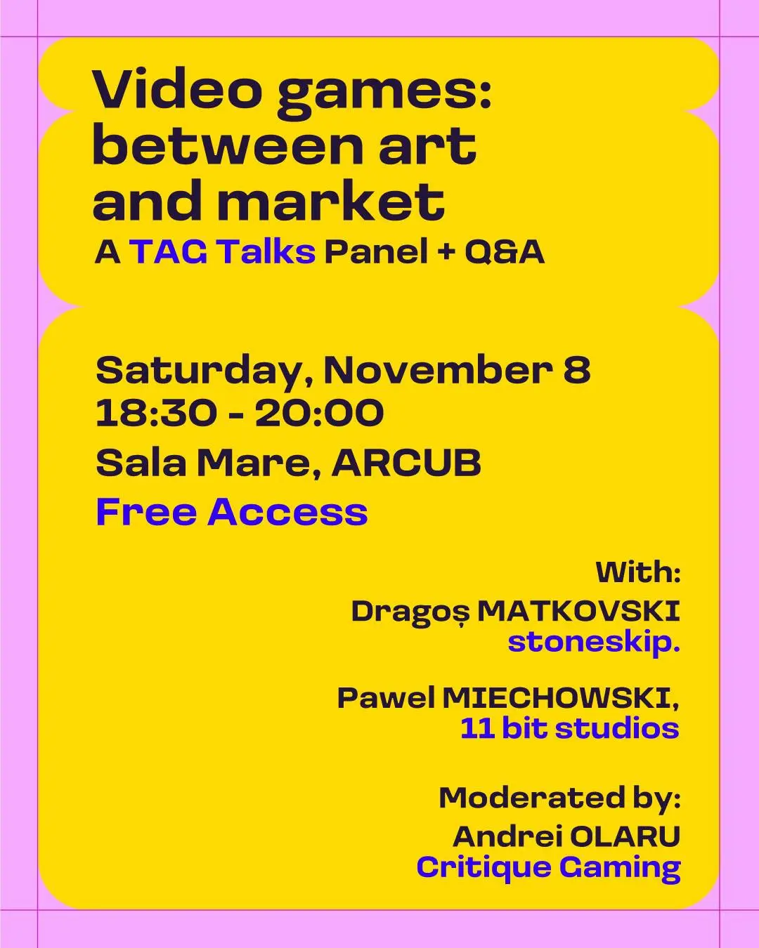 Seara continuă de la 18:30 cu „TAG Talks: Video Games — between art & market”, o dezbatere despre echilibrul dintre creație artistică și sustenabilitate economică. Printre participanți se numără Dragoș Matkovski (stoneskip Studio) și Paweł Miechowski (11 bit studios), moderați de Andrei Olaru, fondatorul studioului independent românesc Critique Gaming. Discuția promite o perspectivă onestă asupra dilemelor și responsabilităților creatorilor de jocuri video.