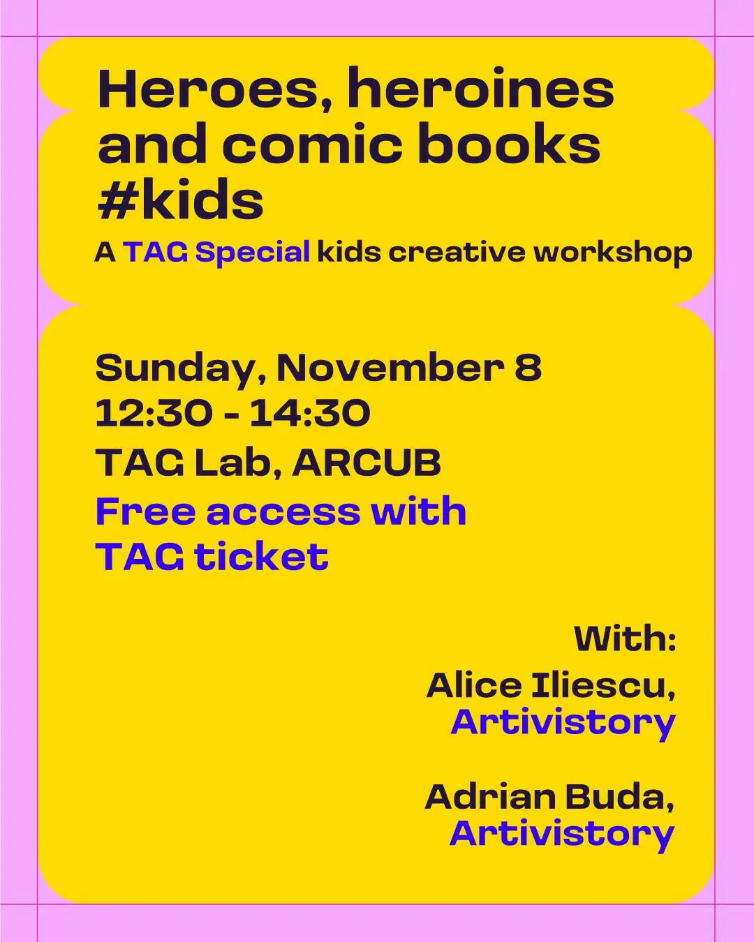 Duminică, 9 noiembrie, atenția se mută asupra celor mai tineri participanți. În cadrul TAG Laboratory de la 12:30, copiii între 10 și 13 ani vor putea lua parte la atelierul „Eroi, eroine și benzi desenate”, coordonat de artiștii clujeni Alice Iliescu și Adrian Buda din colectivul ArtiViStory. Micii participanți vor crea planșe de benzi desenate inspirate de eroii lor preferați, lucrările urmând să fie expuse pe toată durata evenimentului.
