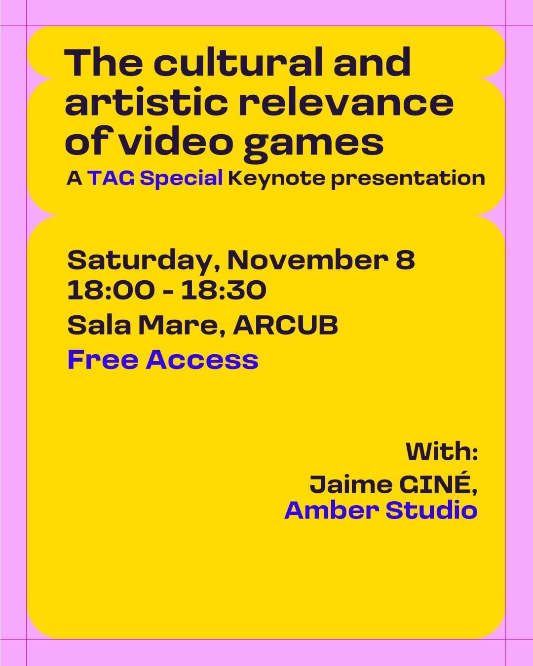 Tot sâmbătă de la 18:00, în cadrul TAG Special, va urca pe scenă Jaime Giné, fost CEO și actual consilier al Amber Studio. Prelegerea sa, „The cultural and artistic relevance of video games”, va explora impactul cultural al jocurilor asupra societății moderne.