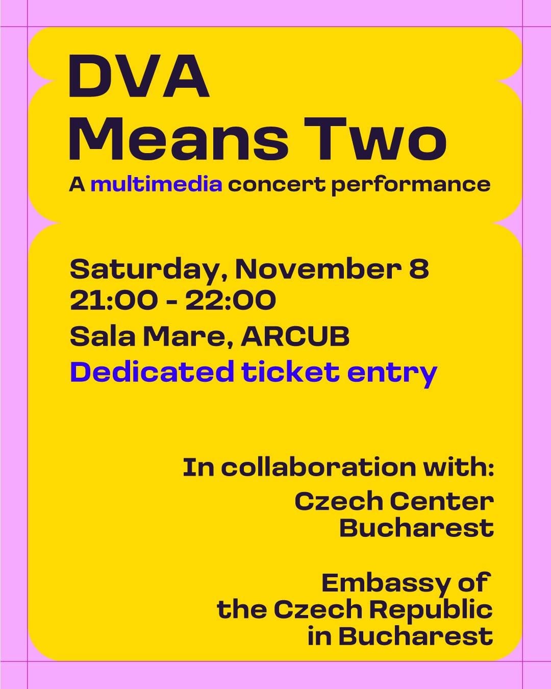 Ziua se va încheia cu un concert multimedia semnat DVA (21:00-22:00), duo-ul ceh Bára Ungerová și Jan Kratochvíl, cunoscuți pentru contribuțiile lor la coloanele sonore ale jocurilor semnate de Amanita Design (seria Machinarium). După o pauză de zece ani, cei doi revin pe scenă cu noul album Piri Piri, într-un show care promite să îmbine muzica, proiecțiile și spiritul liber al culturii indie.
