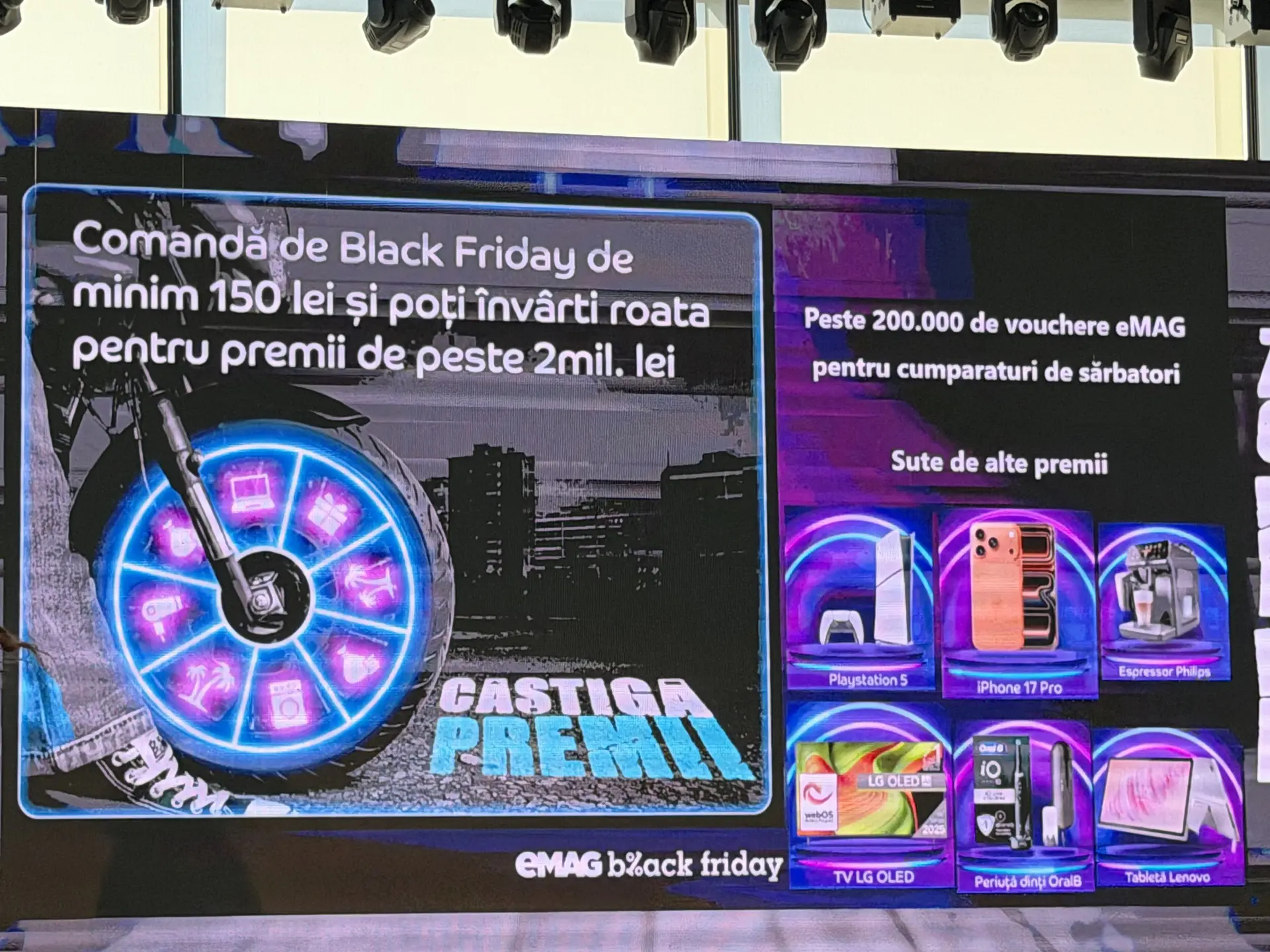 eMAG introduce în premieră un sistem de recompense interactive. Cei care plasează comenzi de cel puțin 150 de lei pot participa la tombola „Roata Norocului”, unde se pot câștiga vouchere și premii în valoare totală de peste 2 milioane de lei. În paralel, prin înscrierea în Ghidul de Black Friday, clienții intră automat într-o altă tombolă care oferă peste 140 de premii, de la un iPhone 17 Pro Max la PlayStation 5, espressoare de cafea, televizoare OLED și până la greutatea câștigătorului în pizza de la Luca.