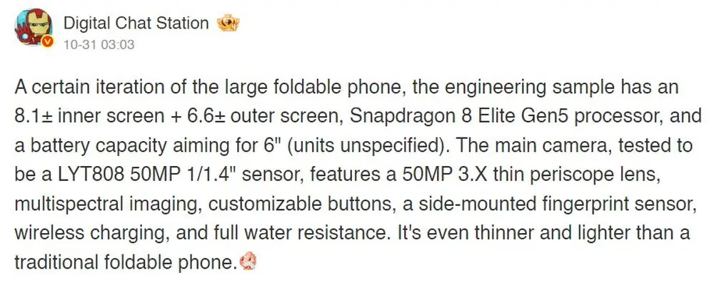 Find N6 va fi echipat cu un ecran pliabil principal de 8,1 inci și un display extern de 6,6 inci, spune celebrul leaker Digital Chat Station (DCS), pe profilul său de pe rețeaua Weibo. Se pare că la interior telefonul va folosi cel mai nou chipset high-end de la Qualcomm, Snapdragon 8 Elite Gen 5, semn că Oppo vizează performanțe de top similare celor oferite de flagship-urile nepliabile ale anului 2026. Autonomia va fi asigurată de o baterie generoasă, estimată la aproximativ 6.000 mAh, ceea ce ar reprezenta un salt semnificativ față de generația anterioară și față de concurența din piață.