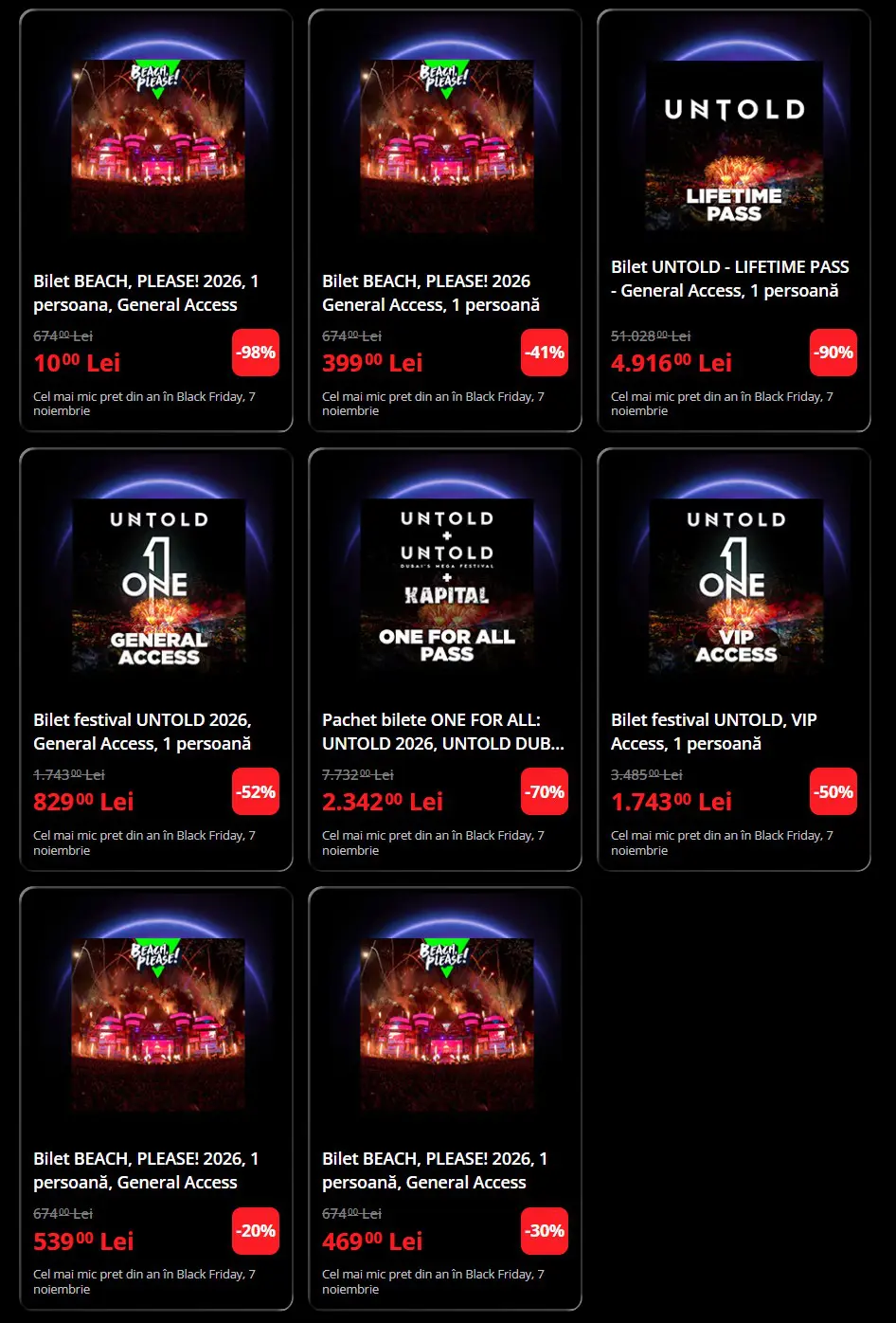 - Pachet bilete ONE FOR ALL: UNTOLD 2026, UNTOLD DUBAI și KAPITAL – 2.342 Lei (redus de la 7.732 Lei)