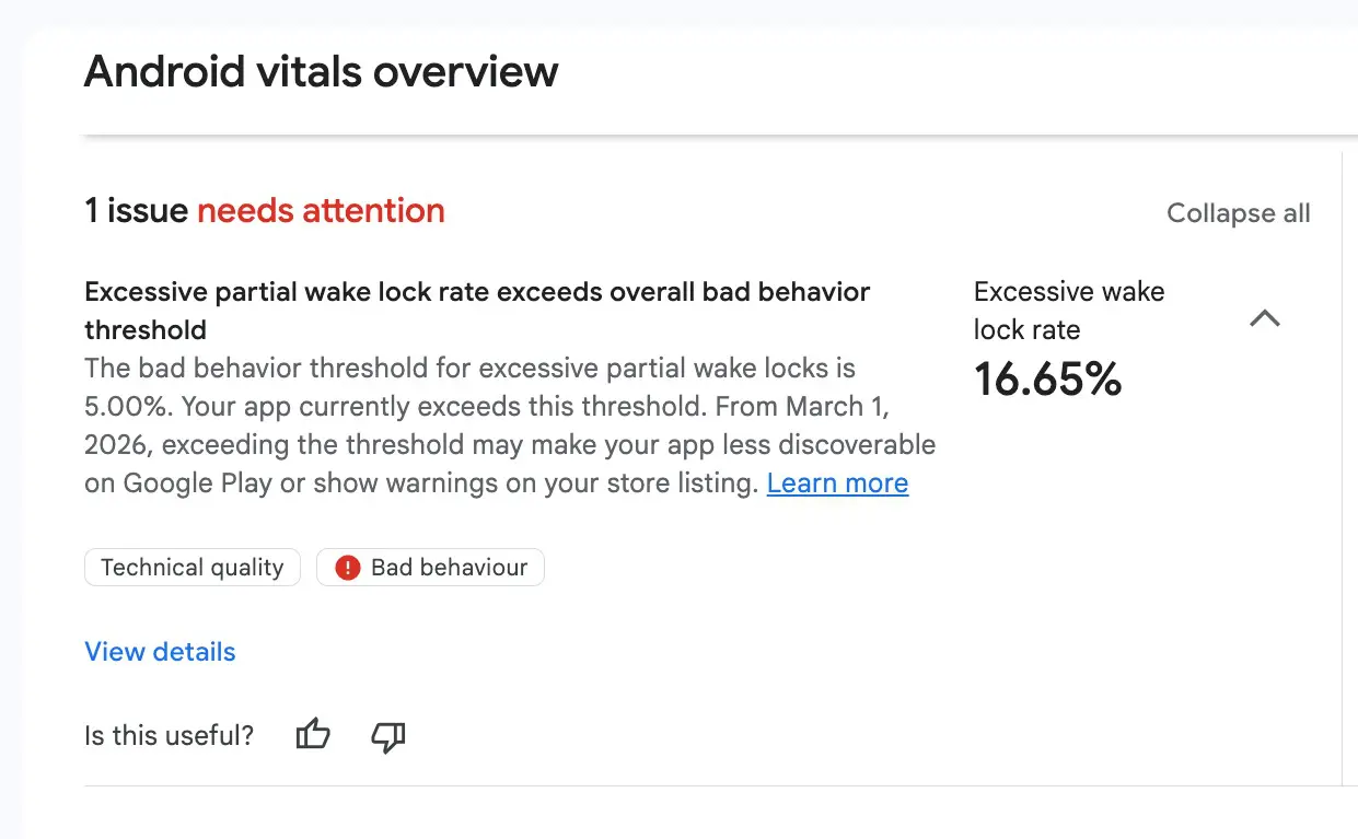 Pe lângă noua categorie „Excessive Partial Wake Locks”, pragurile Android Vitals includ și alte criterii de performanță: rata de crash-uri percepute de utilizatori, rata ANR (Application Not Responding) și consumul excesiv de baterie, definit drept depășirea unei utilizări de 4,44% pe oră pentru fețele de ceas sau aplicațiile de fundal.
