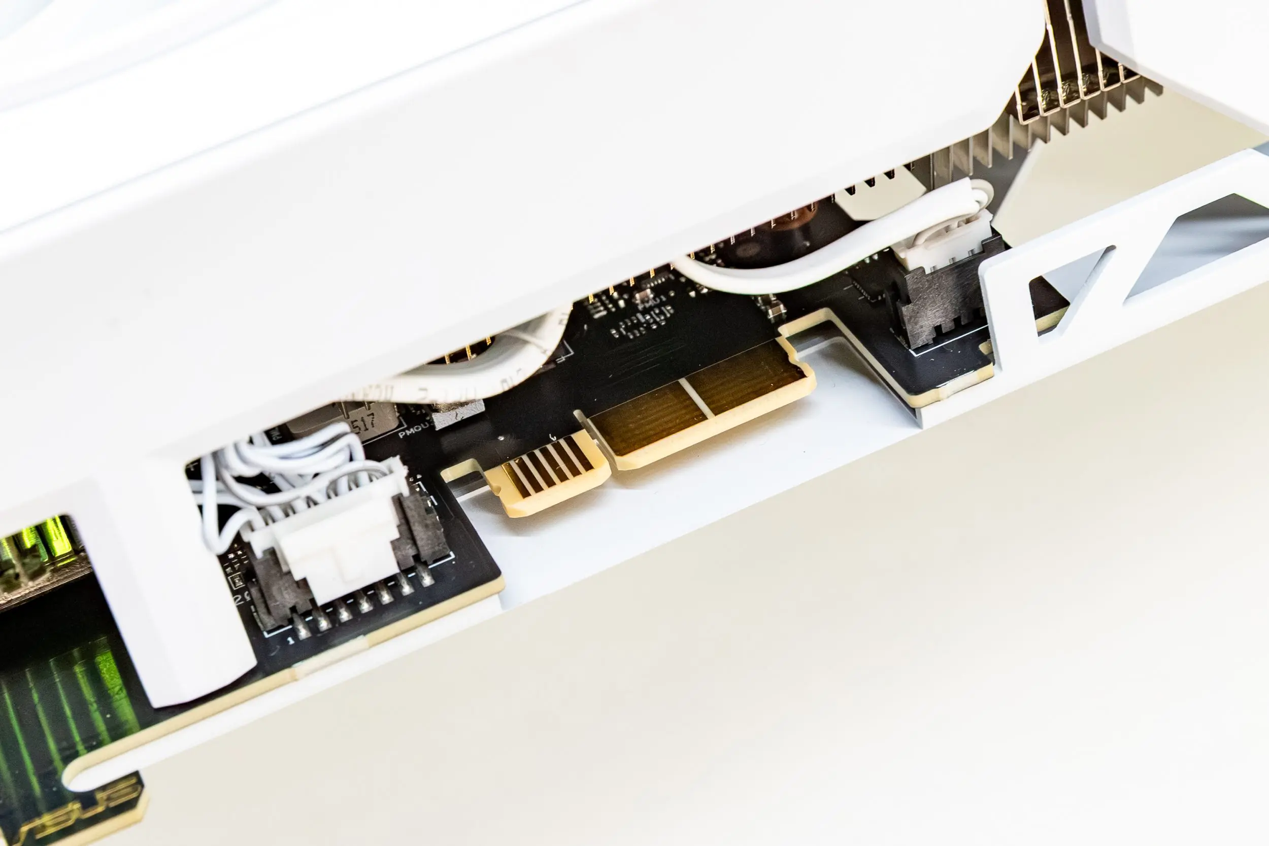 Iar cealaltă chestie mișto la placa asta este a doua parte din nume, adică BTF White Edition. White știm ce reprezintă, placa este de culoare albă. Dar mai avem acest BTF, care ne indică faptul că avem la pachet un conector special care permite alimentarea plăcii video direct din placa de bază, pentru a elimina nevoia unui cablu de alimentare suplimentar. Plăcile de bază cu aceste capabilități se numesc BTF în ograda ASUS și vin cu toți conectorii de alimentare ascunși pe partea din spate. Astfel wire management-ul se întâmplă pe partea întunecată a lunii, iar în față avem airflow fără restricții și un build mult mai ordonat.