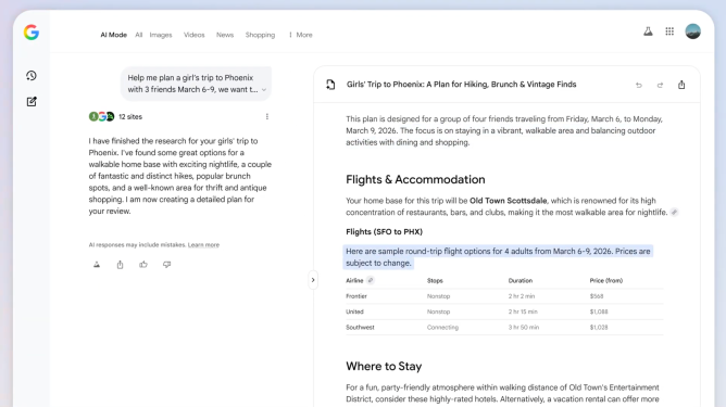 Planificarea călătoriilor cu Canvas este disponibilă pe desktop în SUA pentru utilizatorii care au optat pentru experimentul AI Mode în Labs.