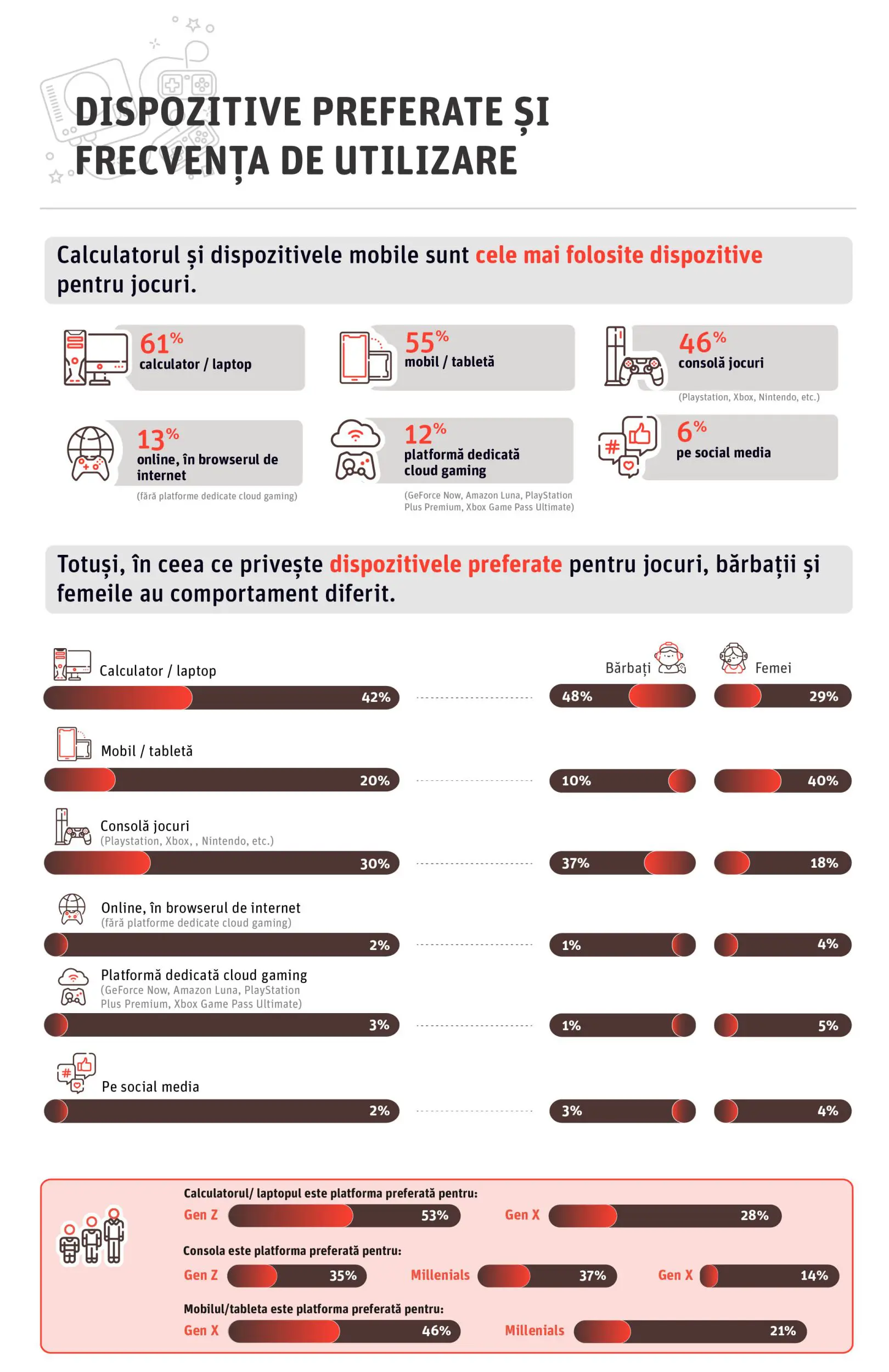 Platforma preferată a gamerului român este PC-ul, dar asta n-ar trebui să ne mire. Sunt sigur că și voi, la fel ca și mine, aveți amintiri despre primul calculator și jocurile care ne-au făcut copilăria mai frumoasă. Iar treaba asta s-a probagat între generații, astfel că 61% dintre gamerii activi din România să joacă pe calculator. Din numărul total de gameri, 42% au spus că preferă PC-ul peste orice altă platformă, ceea ce indică nu doar că ne place să ne jucăm pe ele, dar le alegem în detrimentul consolelor. Și că veni vorba despre acestea, pică mai la coada clasamentului: doar 46% dintre gameri se joacă și pe consolă.