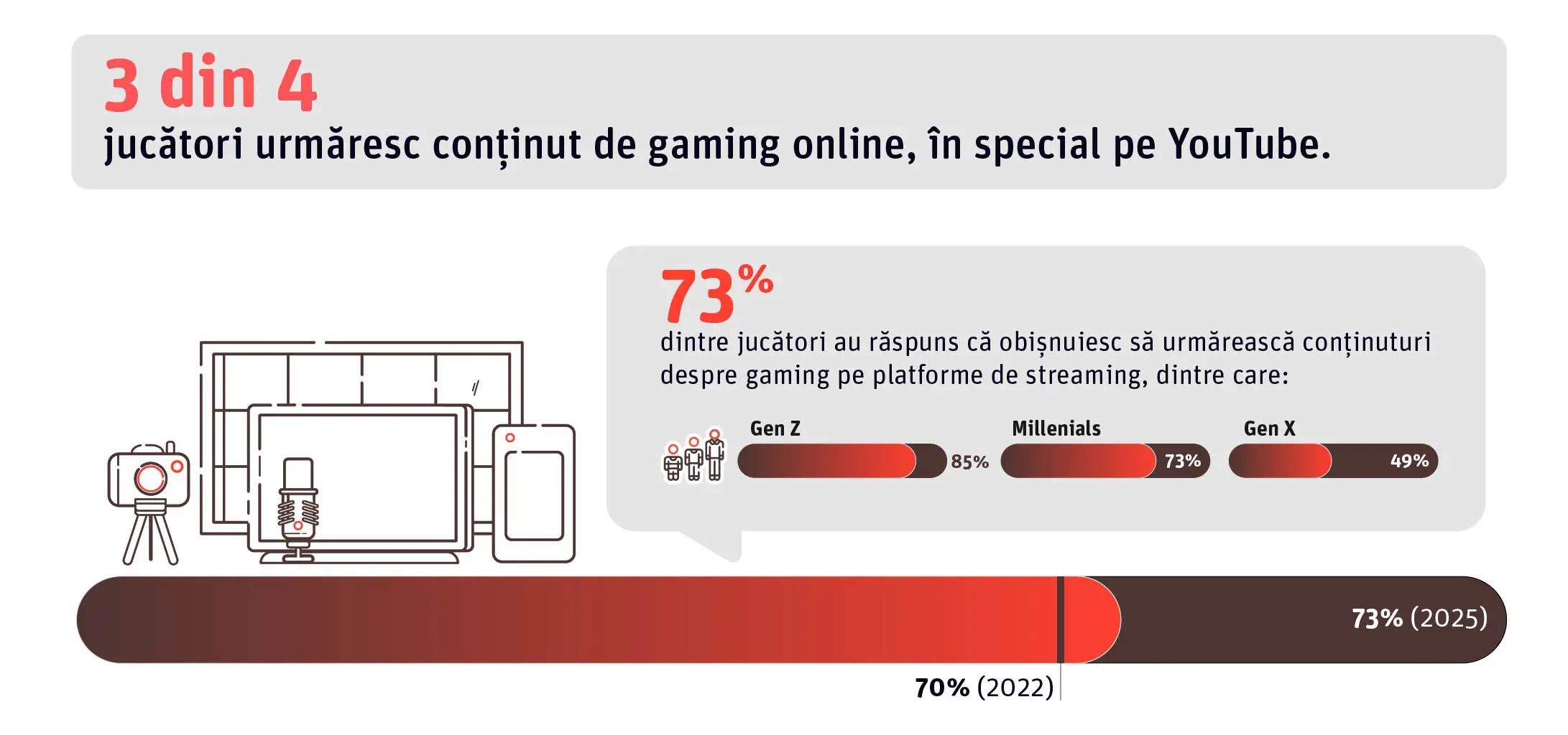 Românii privesc cu ochi buni și influența AI-ului în jocuri, astfel 80% dintre respondenți cred că inteligența artificială va facilita dezvoltarea jocurilor, iar 74% anticipează apariția de conținut generat automat – bine, treaba asta se întâmplă deja, dar deschiderea către noile tehnologii este un semn bun și ne arată că evoluăm ca piață. Streaming-ul video este și el rege printre gamerii din România, astfel că 73% dintre cei care se joacă mai și urmăresc content despre gaming. Platforma preferată de români este YouTube-ul, astfel că Twitch și competiția nu prea au prins avânt mare la noi.