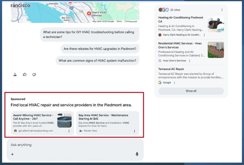 Acum, pe măsură ce utilizatorii s-au obișnuit cu interacțiunea bazată pe AI, Google începe să integreze componenta financiară, adăugând conținut sponsorizat și în acest segment. Anunțurile vizibile includ servicii de urgență, cum ar fi instalatorii, promițând intervenții rapide, ceea ce sugerează o orientare către interogările cu intenție comercială ridicată.