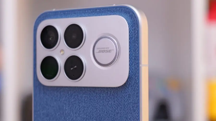 Revenind la design și construcție, F8 Ultra nu reinventează roata: are margini drepte din aluminiu, rezistență la apă IP68 și un platou pentru camere tot metalic. Acesta din urmă nu este pus acolo doar de dragul design-ului. Dacă pe Xiaomi 17 Pro Max am văzut acel ecran secundar, POCO F8 Ultra renunță la el pentru a aduce o altă… să îi spunem inovație: al treilea difuzor. Practic, acest telefon integrează un subwoofer, folosit alături de celelalte două pentru a asigura redare audio 2.1. Și dacă pentru camere POCO nu are parteneriat cu Leica, măcar pentru sunet, a legat un parteneriat cu producătorul de echipamente BOSE.