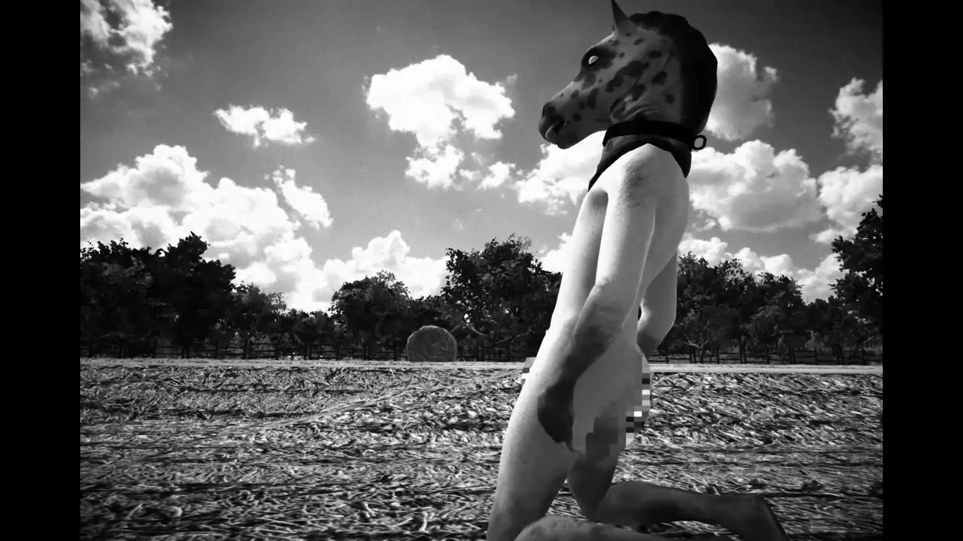 Fermierul vorbește despre cai, dar în realitate în herghelie se află doar oameni complet dezbrăcați, cu măști de cai pe cap. Aceștia par să fie într-o stare de hipnoză, întrucât chiar și ei cred că sunt cai. Anselmo, de frică sau poate pur și simplu din nepăsare, acceptă imediat situația și îi tratează pe acești „prizonieri” ca atare. Ah da, și câinele este tot un om cu mască… nu există niciun animal real în toată ferma.