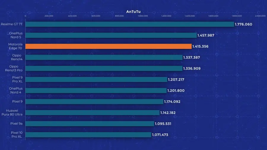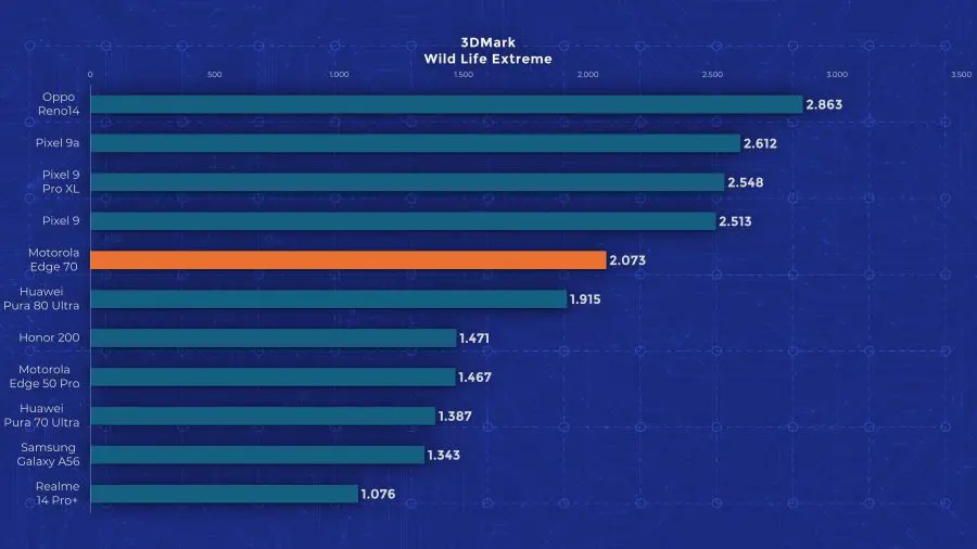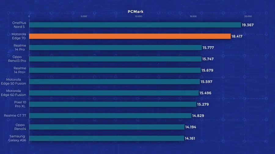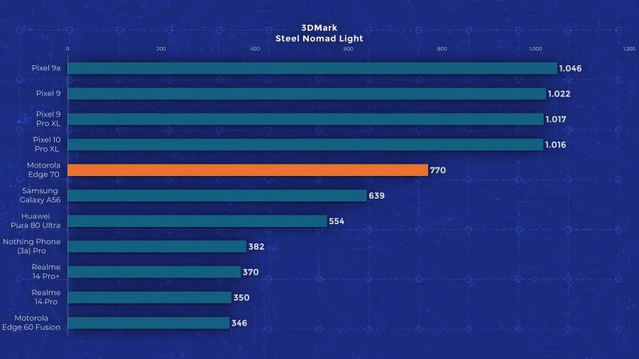 Edge 70 are un chipset Snapdragon 7 Gen 4, un model octa-core la 2,8 GHz, bazat pe tehnologia veche de la Qualcomm, nu pe noile nuclee Oryon. Motorola oferă însă 12 GB RAM și 512 GB stocare standard pe Edge 70, ceea ce mi se pare un lucru bun, având în vedere că alte telefoane ultrasubțiri pornesc de la 256 GB. În materie de performanță însă, testele arată limitările lui Edge 70. Se ține bine după alte modele mid-range recente, dar nu iese în evidență cu nimic. În testele de stres păstrează între 60 și 80 % performanță, deci nu excelează nici aici. Măcar are scuza că este mai subțire decât alte modele cu care îl comparăm în grafice.