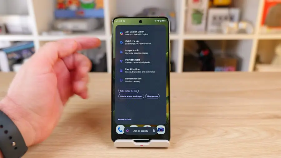 Există un buton dedicat pentru funcțiile AI pe laterala din stânga, care, din păcate nu poate fi reconfigurat pentru altceva. Sincer, nu sunt un mare fan al acestui concept de buton special pentru o selecție de funcții aparent aleatorii. De exemplu, pe lângă Gemini, care e inclus în Android, mai ai alți doi chatboți în Moto AI: Copilot și Perplexity. Iar rezumarea notificărilor nu este inclusă direct în notificări, ci trebuie apelată direct din acest meniu special.