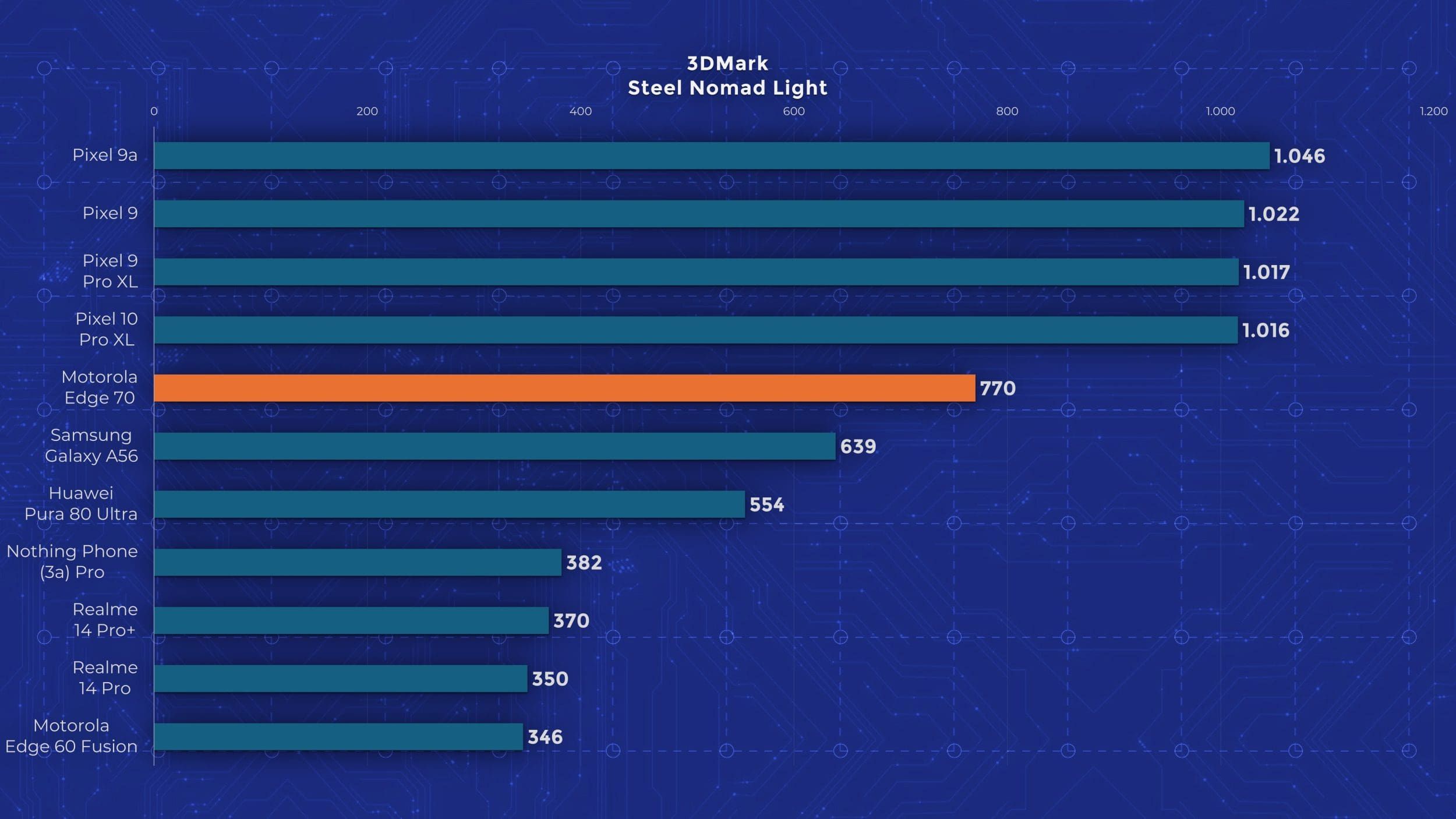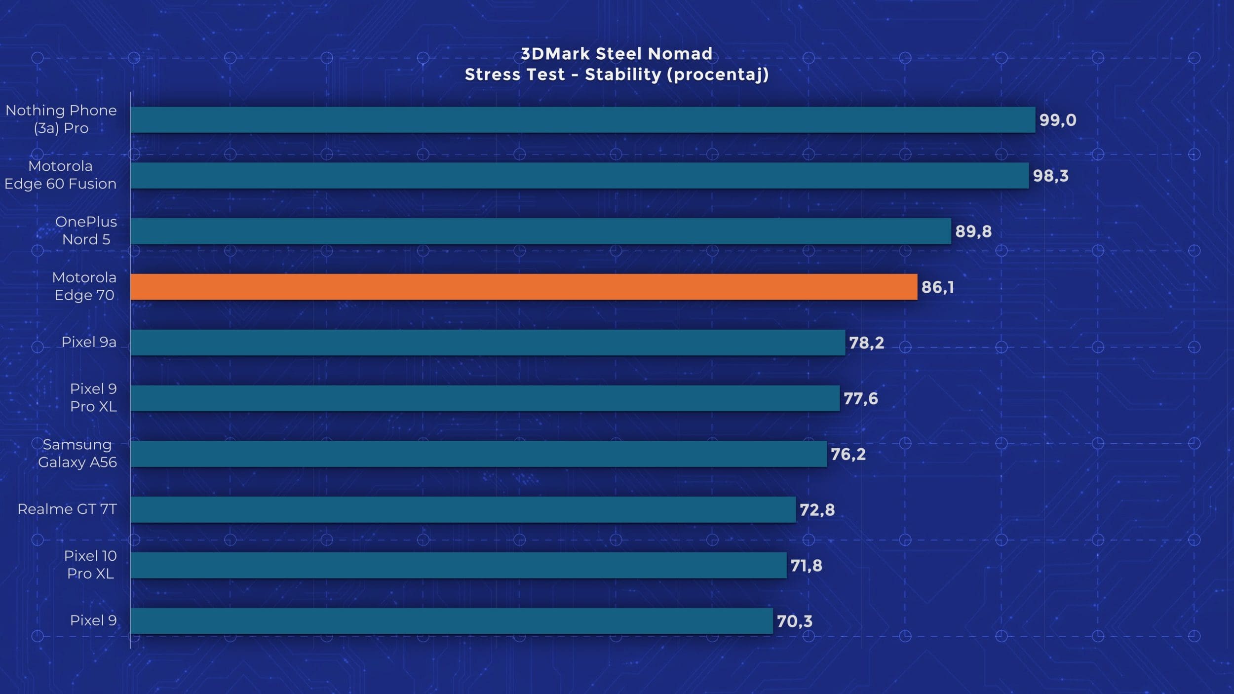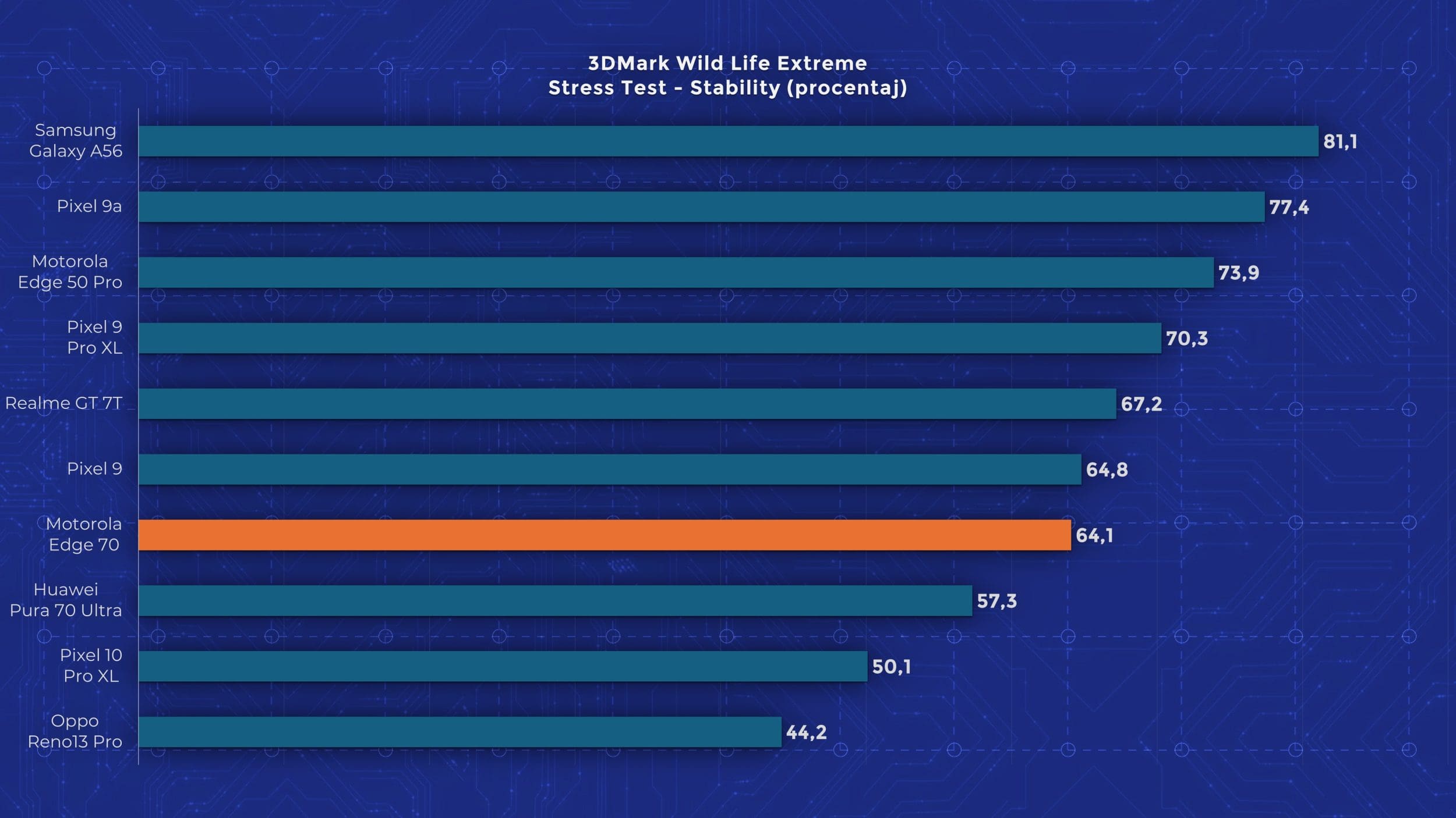 Edge 70 are un chipset Snapdragon 7 Gen 4, un model octa-core la 2,8 GHz, bazat pe tehnologia veche de la Qualcomm, nu pe noile nuclee Oryon. Motorola oferă însă 12 GB RAM și 512 GB stocare standard pe Edge 70, ceea ce mi se pare un lucru bun, având în vedere că alte telefoane ultrasubțiri pornesc de la 256 GB. În materie de performanță însă, testele arată limitările lui Edge 70. Se ține bine după alte modele mid-range recente, dar nu iese în evidență cu nimic. În testele de stres păstrează între 60 și 80 % performanță, deci nu excelează nici aici. Măcar are scuza că este mai subțire decât alte modele cu care îl comparăm în grafice.