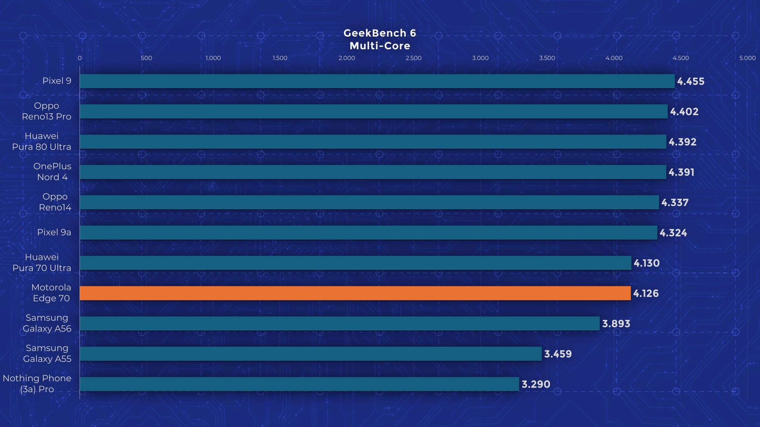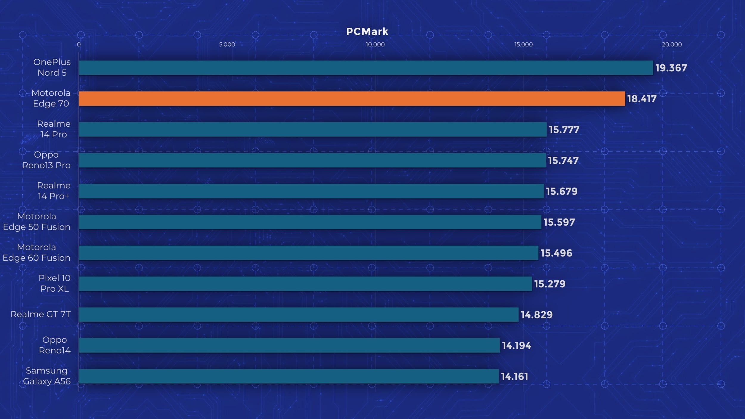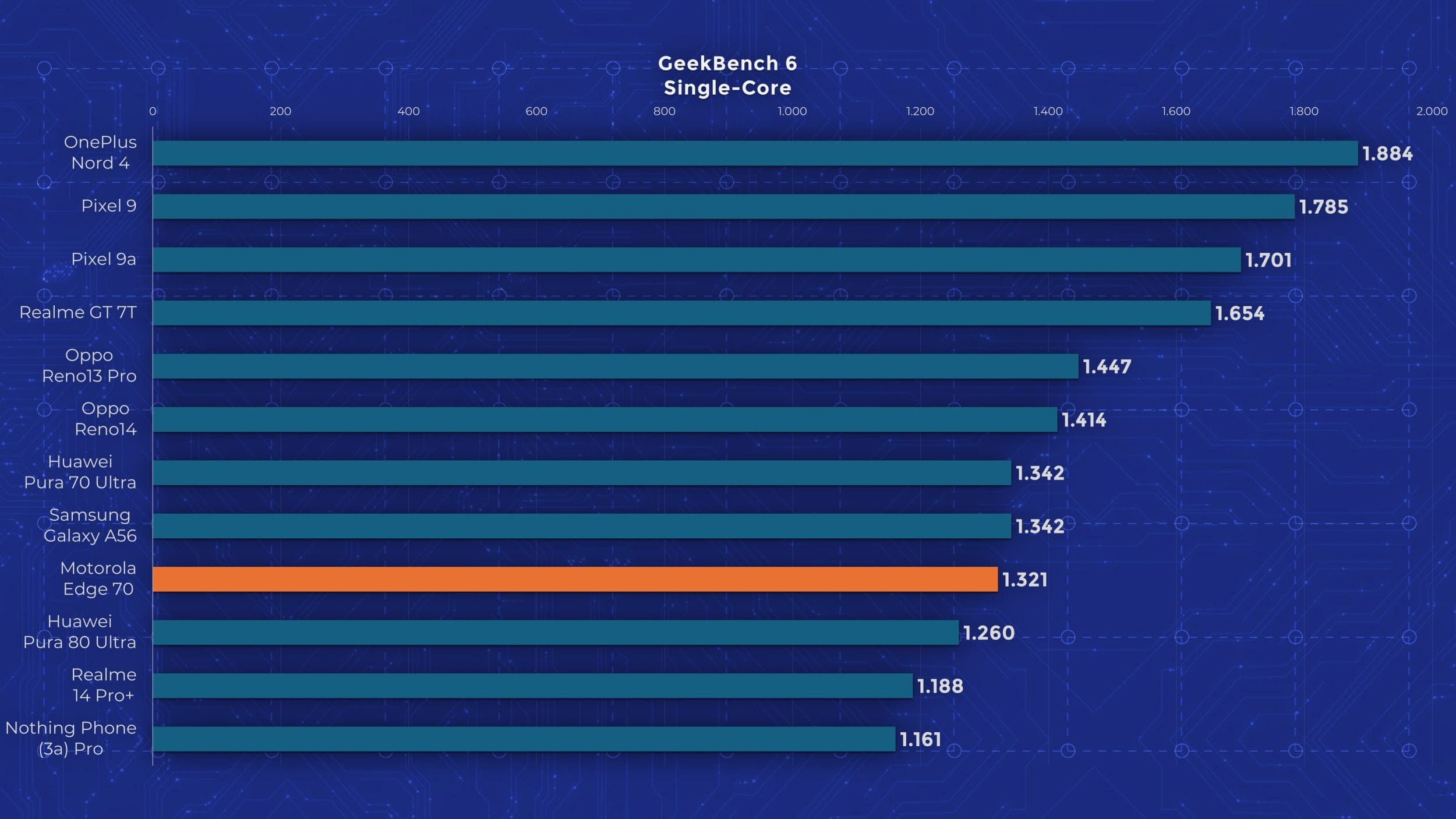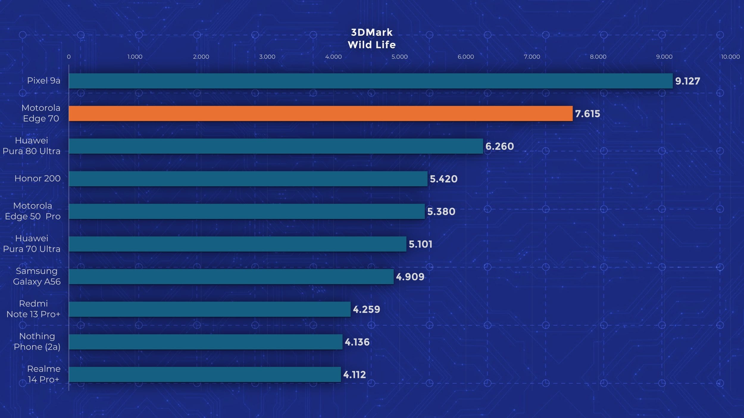 Edge 70 are un chipset Snapdragon 7 Gen 4, un model octa-core la 2,8 GHz, bazat pe tehnologia veche de la Qualcomm, nu pe noile nuclee Oryon. Motorola oferă însă 12 GB RAM și 512 GB stocare standard pe Edge 70, ceea ce mi se pare un lucru bun, având în vedere că alte telefoane ultrasubțiri pornesc de la 256 GB. În materie de performanță însă, testele arată limitările lui Edge 70. Se ține bine după alte modele mid-range recente, dar nu iese în evidență cu nimic. În testele de stres păstrează între 60 și 80 % performanță, deci nu excelează nici aici. Măcar are scuza că este mai subțire decât alte modele cu care îl comparăm în grafice.