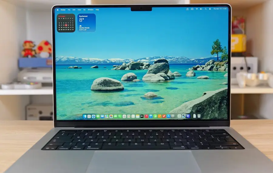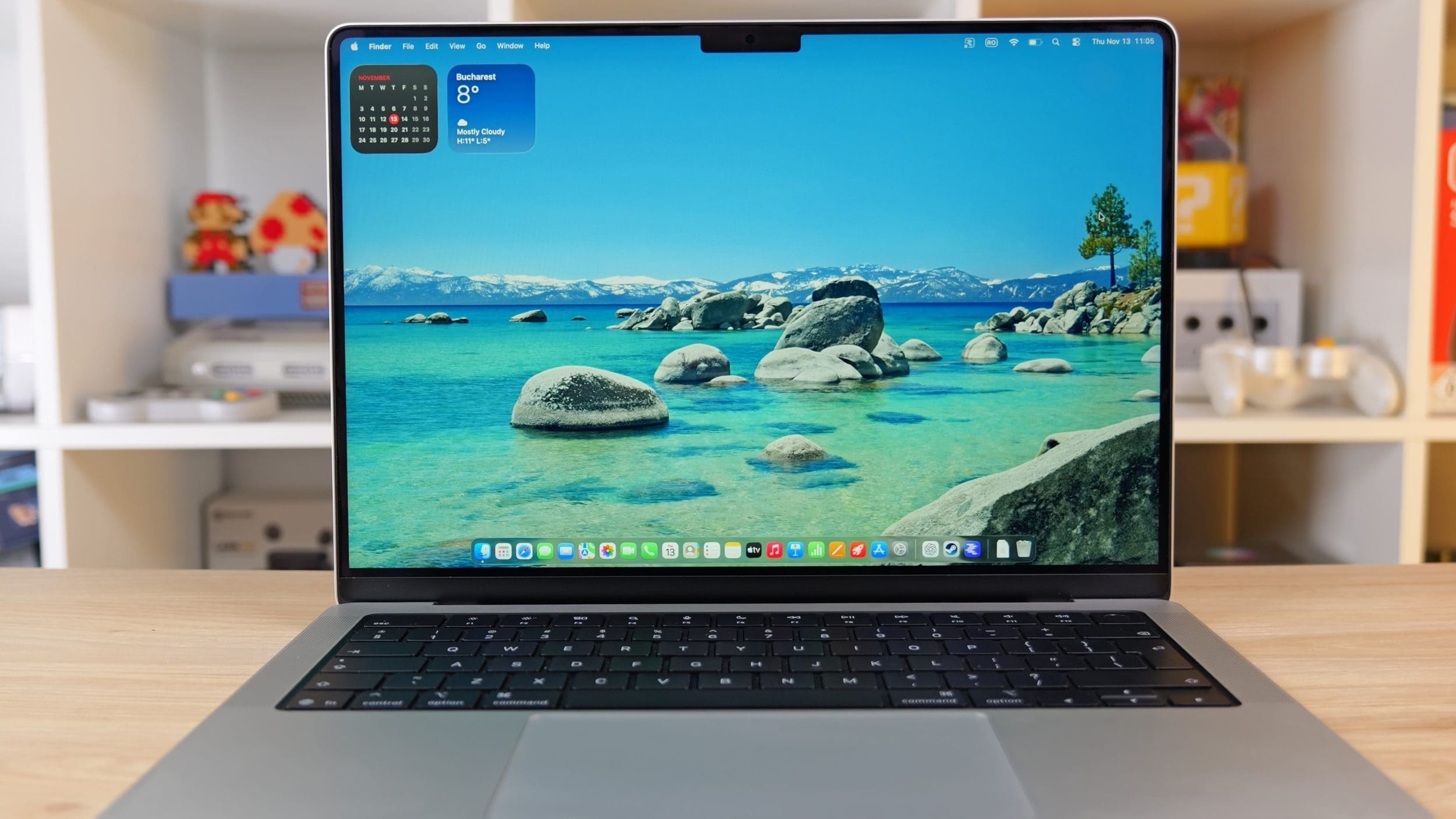 În continuare sunt surprinzătoare două aspecte la acest MacBook. În primul rând ecranul, care este extrem de luminos. Apple zice că atinge 1000 nits pe tot ecranul, și tind să îi cred, iar în HDR poate atinge 1.600. Fiind un ecran Mini-LED, efectul HDR este foarte bun. Nu este chiar la fel ca pe un OLED, dar se apropie destul de mult și este mult mai luminos decât unul. Al doilea aspect sunt difuzoarele, care încă nu au rival în zona de laptop-uri. Deși vorbim despre un laptop de productivitate relativ compact, MacBook Pro-ul are niște difuzoare puternice, pe care poți asculta muzică, vedea filme și te juca fără să simți că sunetul e limitat. Cred că ideea a fost să ofere redare audio bună atunci când editezi video sau editezi muzică în aplicații dedicate.