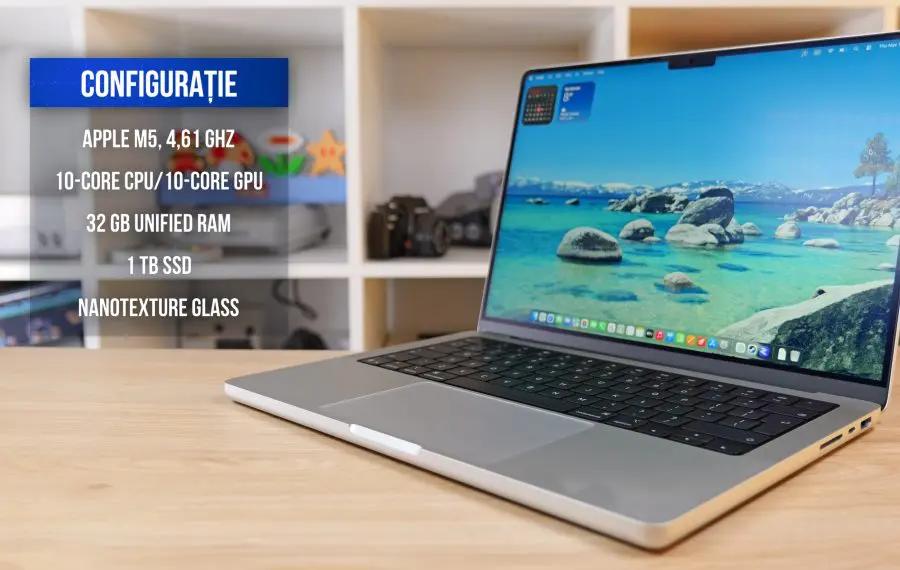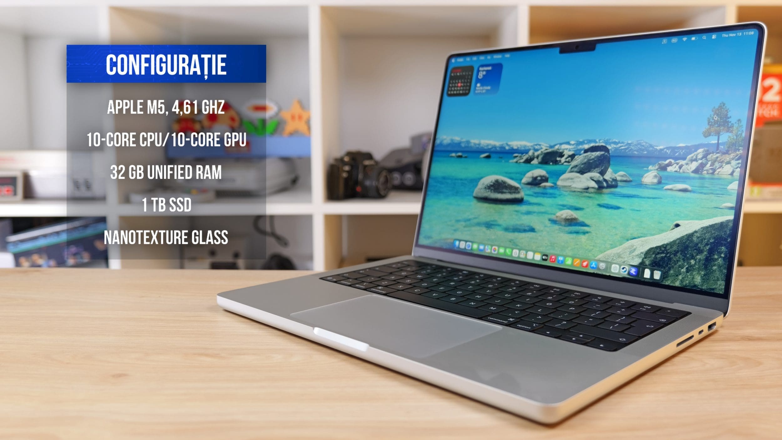 Configurația pe care am avut-o la test era formată din noul procesor Apple M5, un model cu 10 nuclee CPU și 10 nuclee GPU, 32 GB memorie RAM unificată, 1 TB stocare internă și ecran Liquid Retina XDR cu sticlă cu nanotextură, care elimină reflexiile luminii. Este o configurație superioară și cam scumpă dacă mă întrebați pe mine. Ajunge pe la 14.000 lei cu toate cele adăugate. După ce l-am folosit intens vreo două săptămâni, am ajuns la concluzia că m-aș fi descurcat la fel de bine și cu configurația de bază, care costă pe la 9.300 lei, mai ales pentru că diferența de performanță în sarcinile pe care le rulez eu este zero.
