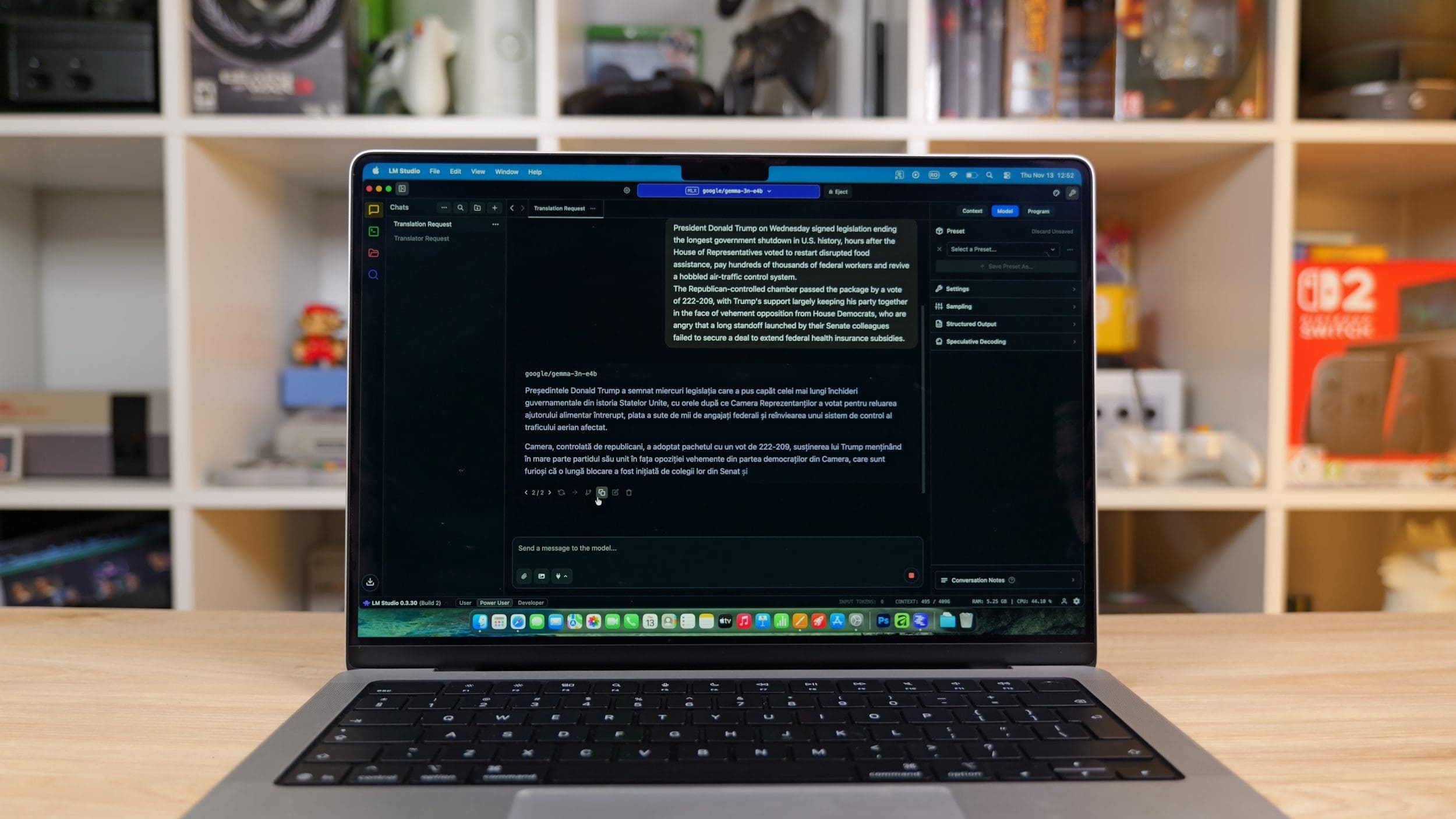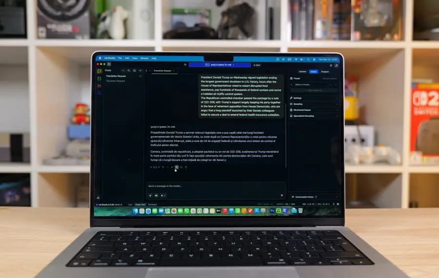 Pentru că procesarea AI din M5 a primit un upgrade important. Multe aplicații de creație au funcții AI integrate, dar eu nu prea le folosesc, așa că am instalat LM Studio, aplicația care îți permite să rulezi un model linvgistic cu AI local, fără conexiune la internet. Am pus câteva, precum versiunea open source a lui ChatGPT de la OpenAI, Gemma de la Google și Deepseek. M-am jucat puțin cu ele și am fost surprins de viteza pe care o pot avea în răspunsuri, rulând pe un laptop cu un GPU integrat și doar 32 GB memorie. Apple s-a lăudat că memoria are mai multă lățime de bandă și se pare că chiar ajută. Acum nu știu dacă aș renunța la abonamentul ChatGPT Plus pentru un chatbot local, mai ales pentru că ești limitat la versiunea cu 20 miliarde de parametri din cauza RAM-ului, dar în funcție de ce faci cu AI-ul, s-ar putea să te ajute atunci când nu ai o conexiune la internet activă, de exemplu în avion.