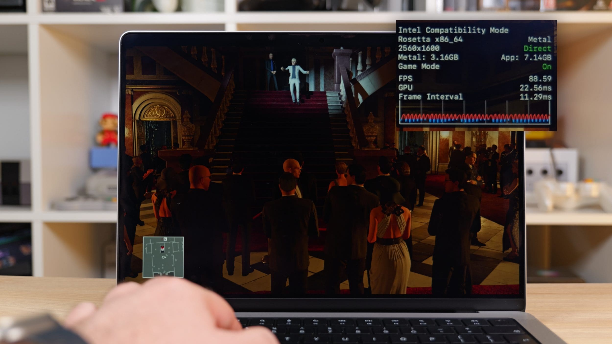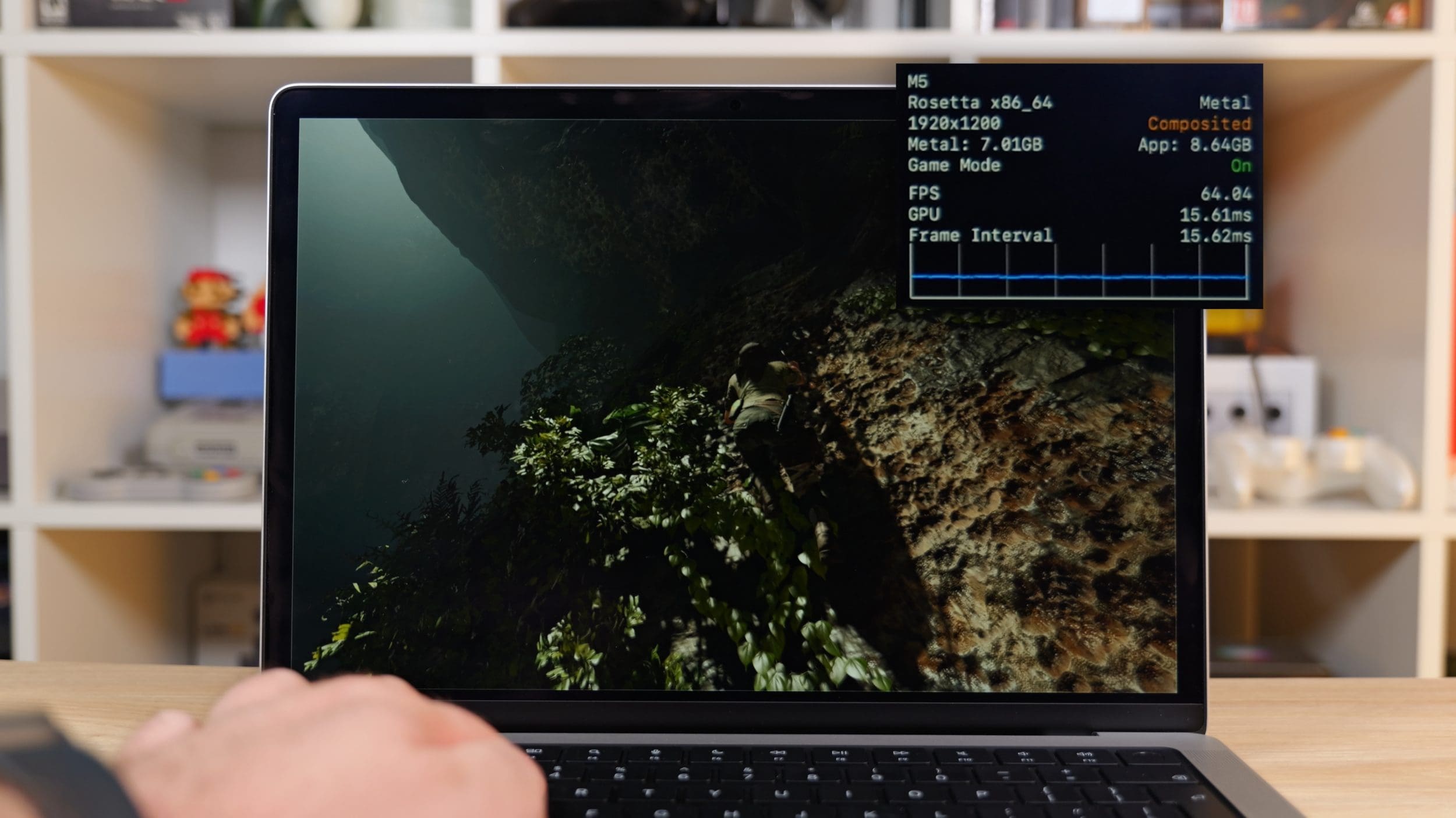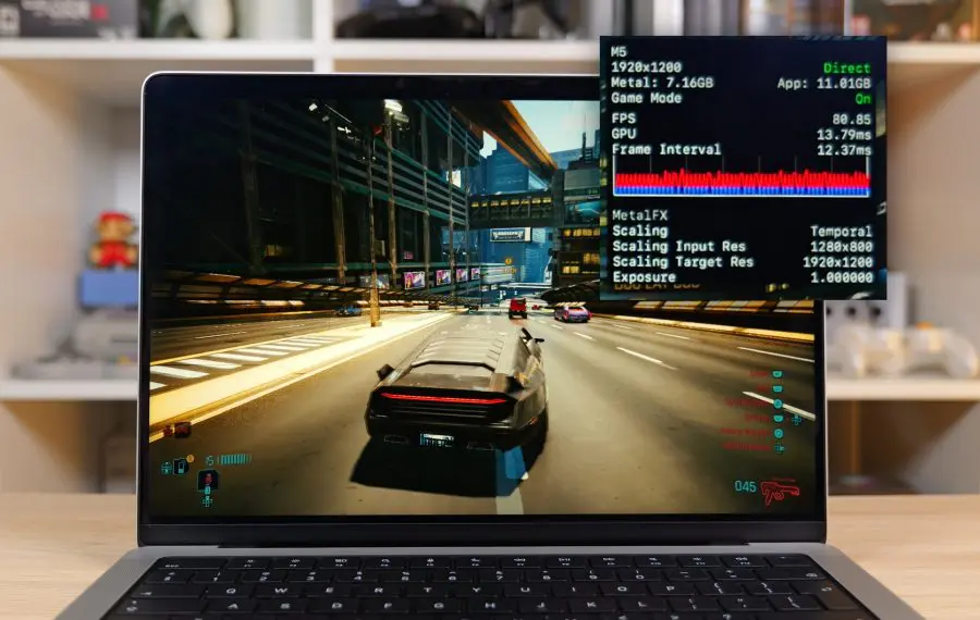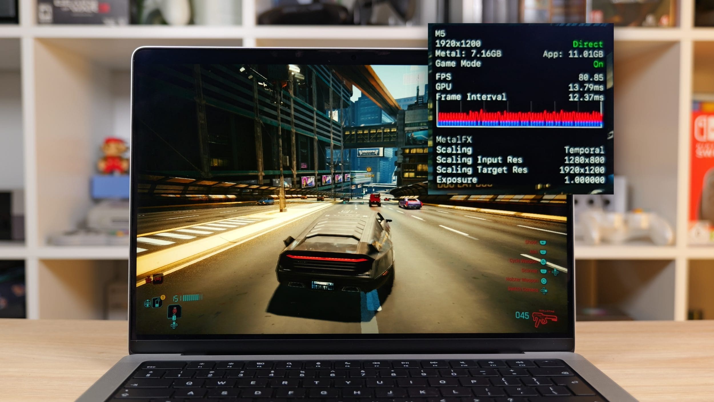 Am testat totuși câteva titluri de pe Steam din librăria mea care sunt compatibile și cu macOS. Cyberpunk 2077, care merge bine în 1080p pe setării medii, deci mai bine decât pe o consolă portabilă, dar nu cu mult. Ajunge pe la 60 FPS, dar nu te poți atinge de setări de ray tracing, pentru că framerate-ul scade la jumătate. Not great, not terrible. Recent, jocul a câștigat și titlul de „jocul anului pentru Mac” în cadrul Apple App Store Awards 2025.