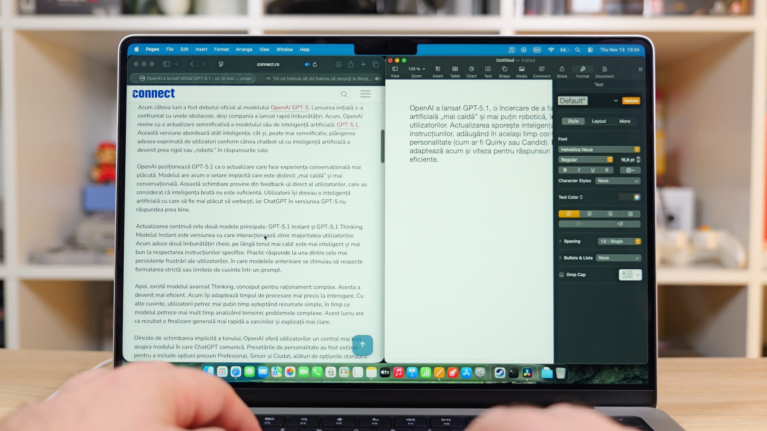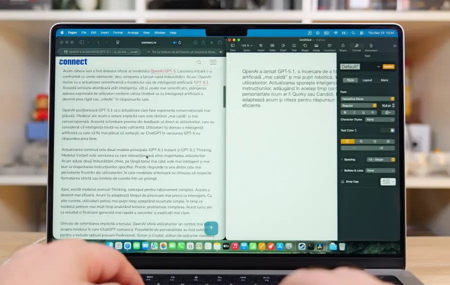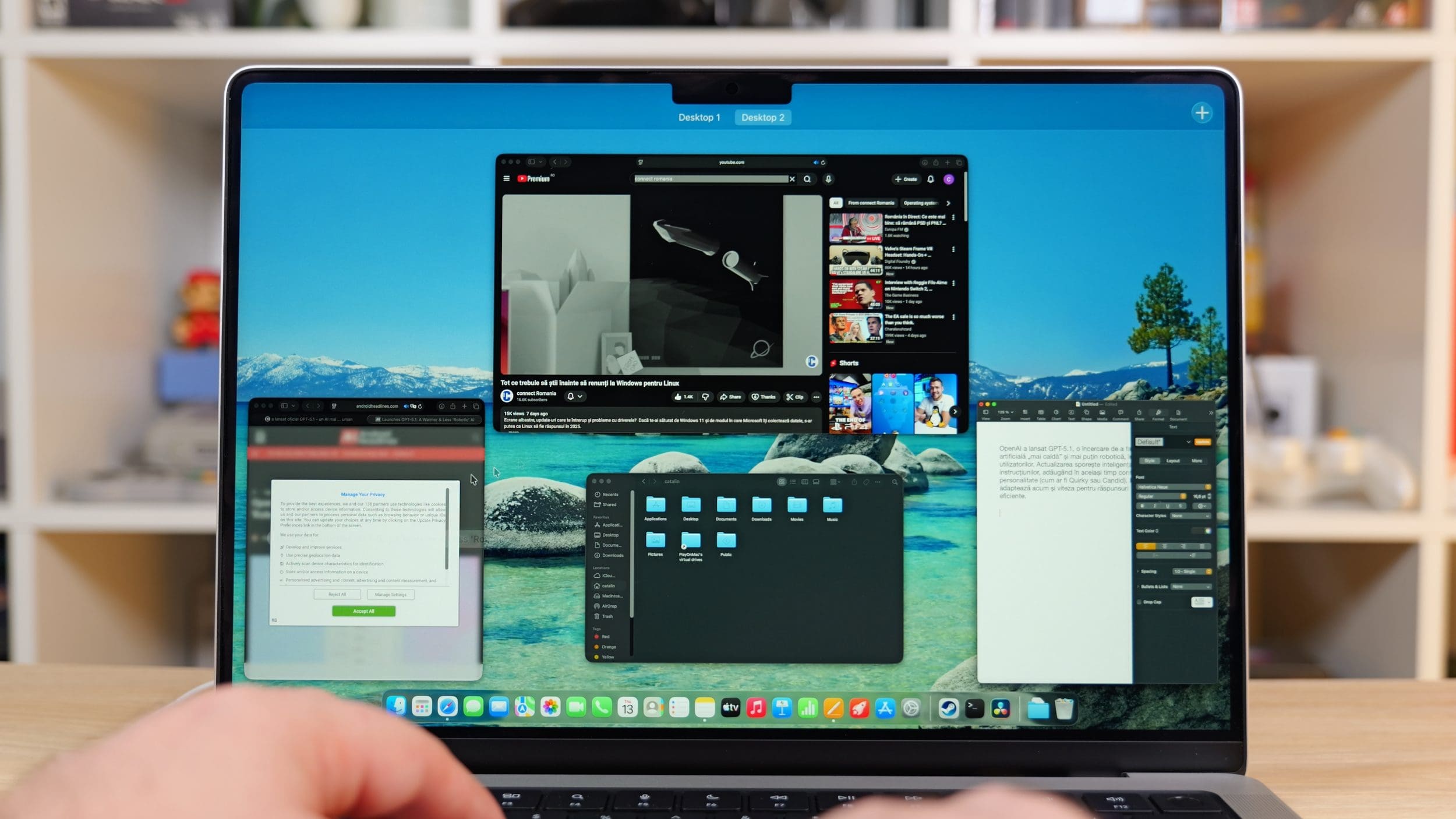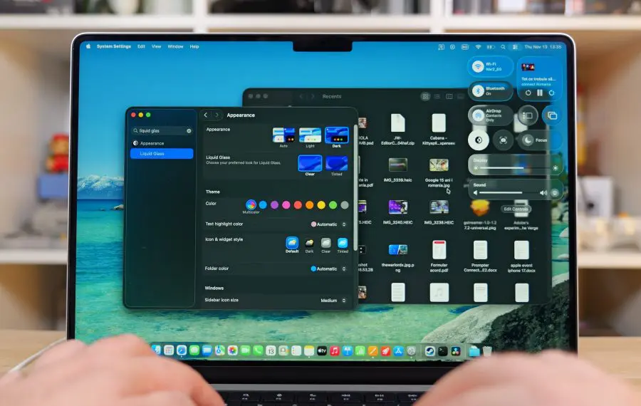 La final o să zic și câteva cuvinte despre noul macOS Tahoe, sau macOS 26, primul care vine cu interfața Liquid Glass. Vine preinstalat și, dacă mă întrebi pe mine, nu arată cu mult diferit față de versiunea anterioară. Liquid Glass este mai puțin enervant pe Mac decât pe iPhone, pentru că aici sunt mai puține căsuțe plutitoare cu transparență. Funcțional, totul este la fel ca până acum, deci dacă îți era frică să faci upgrade, nu este cazul. Doar asigură-te că toate aplicațiile pe care le folosești sunt compatibile cu noul OS, pentru că el în sine este stabil și foarte rapid, mai ales pe cel mai nou procesor de la Apple.