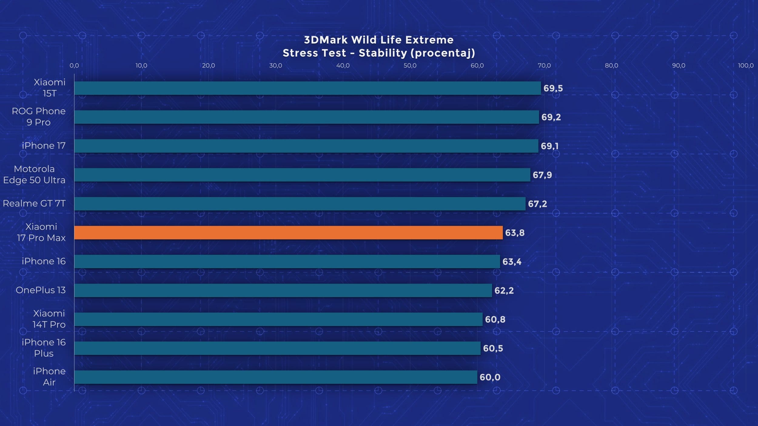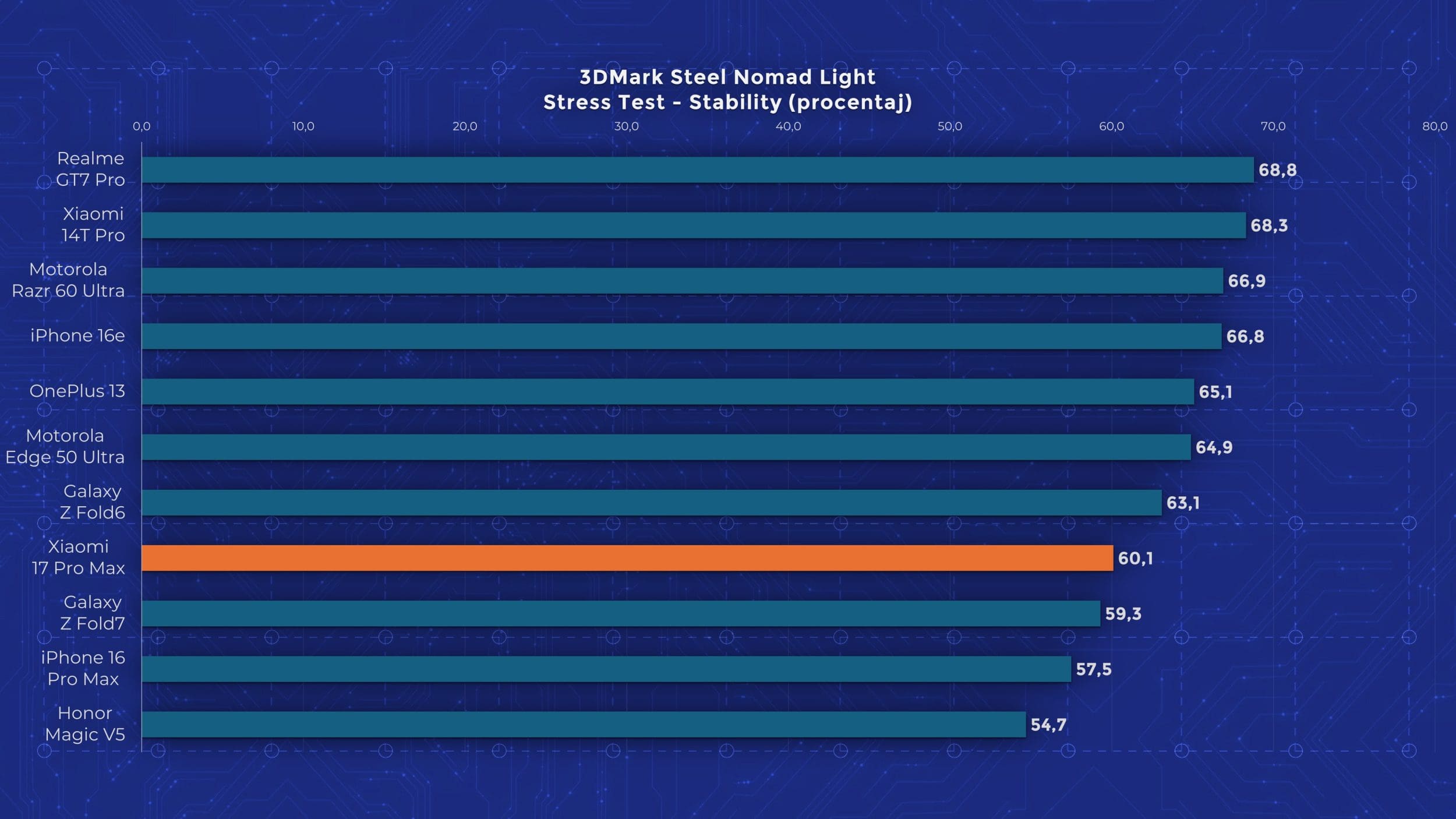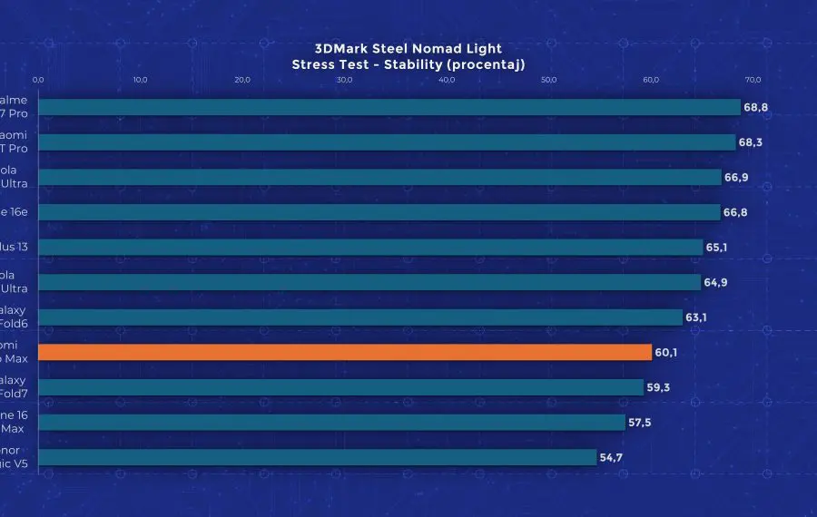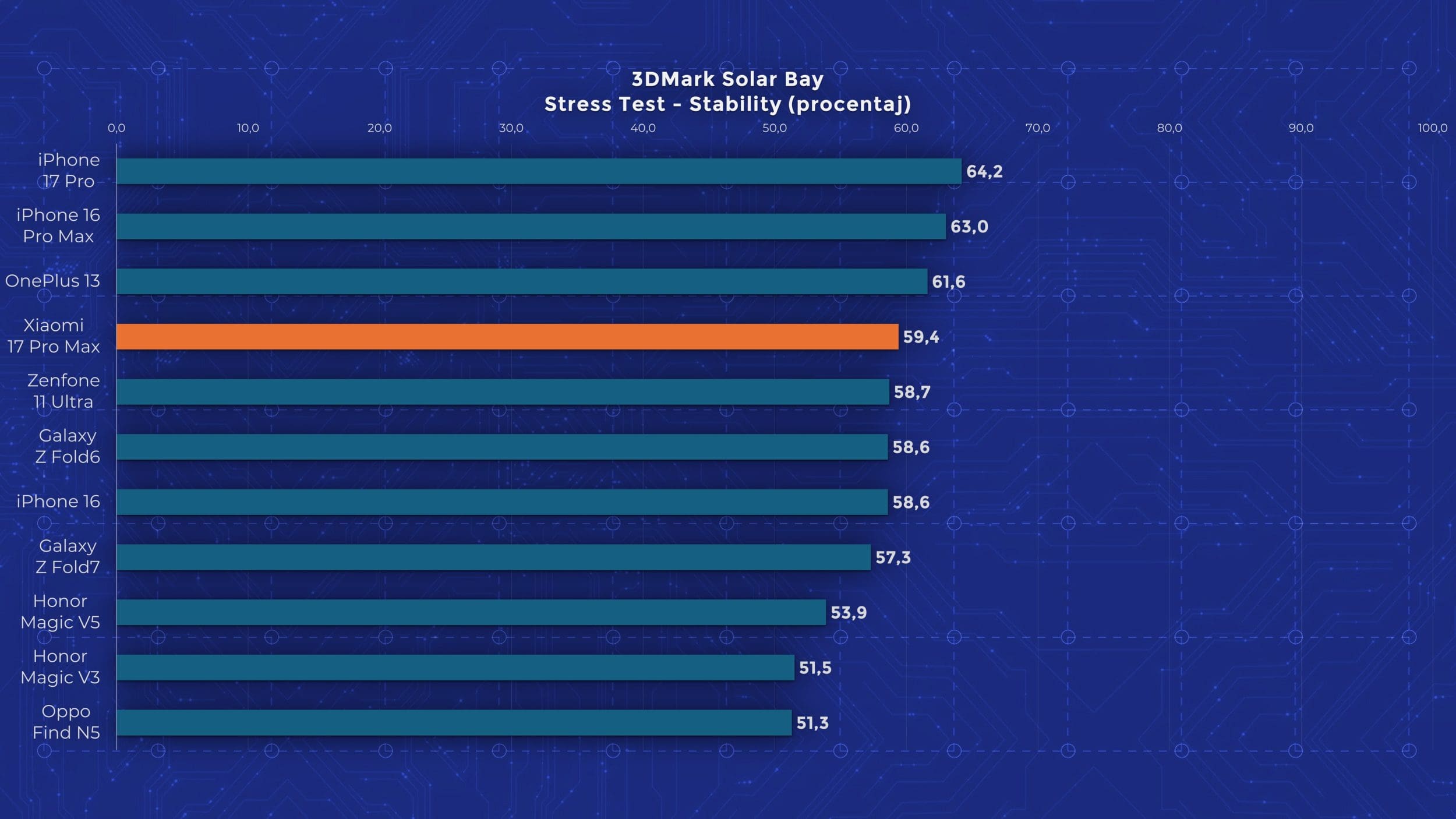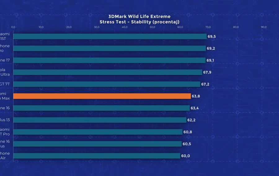 Am însă și vești mai bune referitoare la performanța pe Xiaomi. În primul rând, am putut rula testele fără limite, Xiaomi fiind o companie cunoscută pentru blocarea anumitor aplicații de benchmark. În al doilea rând, telefonul nu se încinge excesiv. A trecut cu bine peste testele de stres și a păstrat cam 60% din performanță, ceea ce e în rând cu alte modele de top din piață. Sunt pe de-o parte mulțumit de faptul că a rezistat și nu s-a mai închis, așa cum am văzut pe modelele Xiaomi 14 și 15 din trecut. De încins se încinge, dar acestea sunt cazuri extreme și nu vei întâlni asta în utilizare de zi cu zi. Pe de altă parte, această implementare, chiar și pe modul performance nu ne arată cât de performant poate fi, de fapt Snapdragon 8 Elite Gen 5. Așteptăm un OnePlus, un Realme sau, de ce nu, un ROG Phone pentru a trage concluzii.
