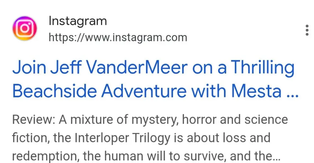 O altă postare de pe Instagram a Bibliotecii Publice Groton din Massachusetts — o imagine a copertei cărții Annihilation de VanderMeer care promova o lectură în grup — nu a inclus nici ea descriere text sau un comentariu. Aceasta apare în rezultatele căutării Google cu următorul titlu: „Alătură-te lui Jeff VanderMeer într-o aventură palpitantă pe plajă alături de Mesta…”.
