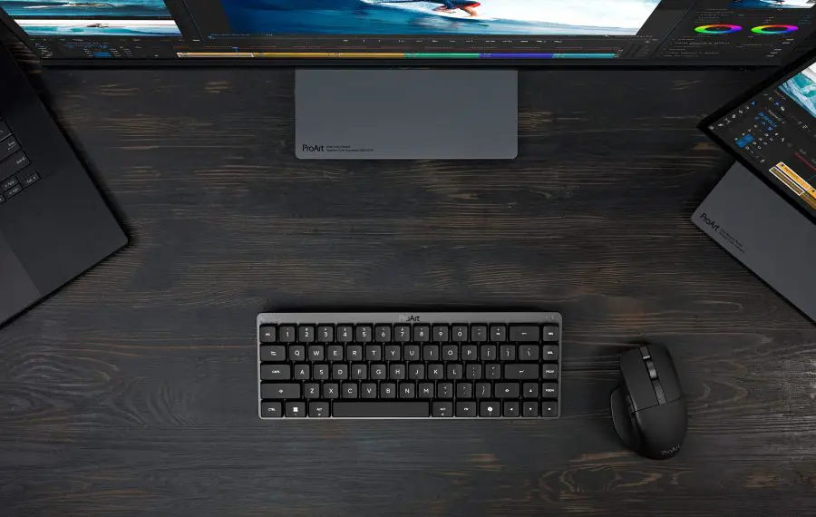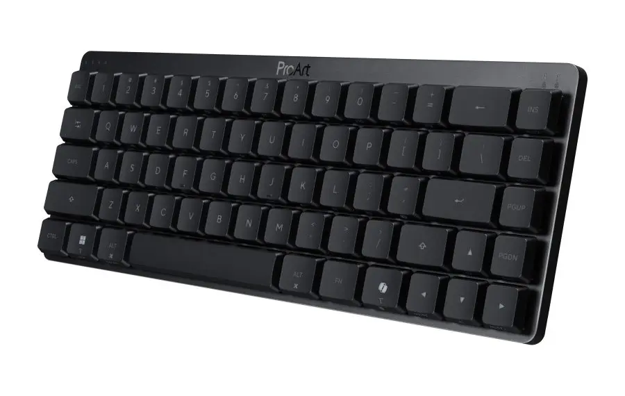 Tastatura ProArt (KD300) completează mouse-ul în zona productivității. Este o tastatură mecanică cu switch-uri low-profile (format 65%) construită în jurul unui capac din aluminiu. Folosește switch-uri optice ASUS RX Red liniare și dispune de un panou tactil personalizabil prin software-ul Gear Link. Tastatura ProArt permite conectarea simultană la cinci dispozitive.