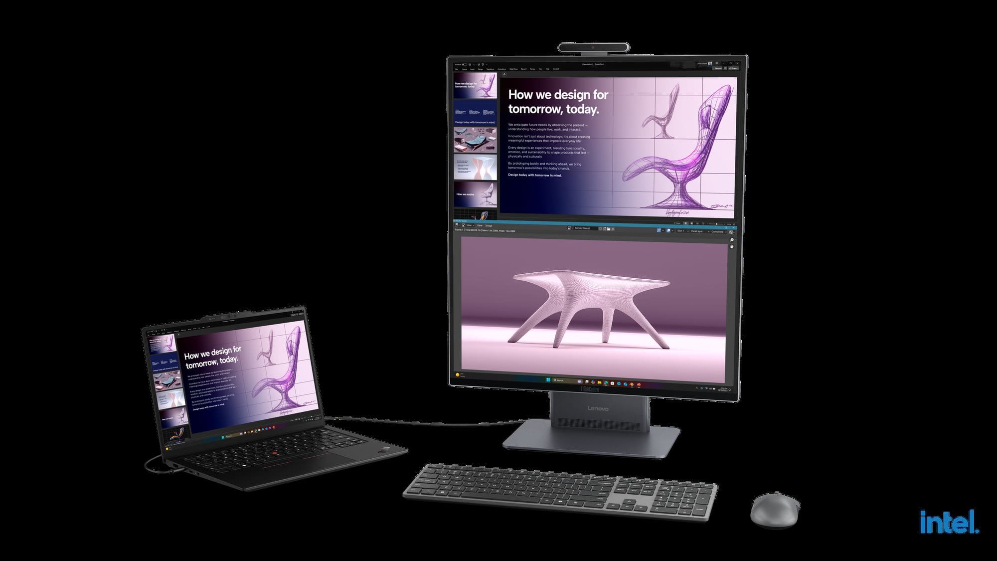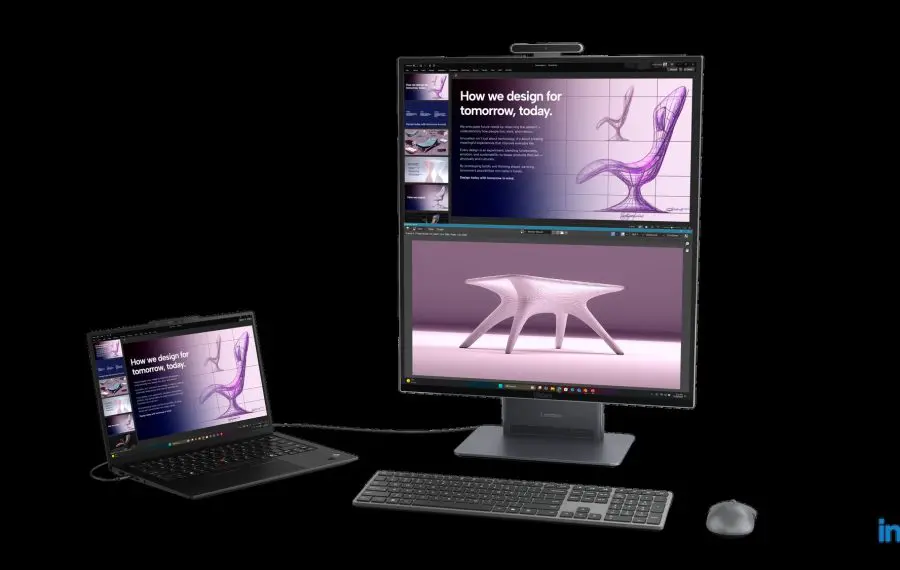 Pe segmentul desktop, Lenovo a introdus două soluții distincte în seria ThinkCentre X. Modelul ThinkCentre X AIO Aura Edition propune un format inedit de ecran de 27,6 inci cu rezoluție QHD și un raport de aspect 16:18, aproape pătrat. Acest format este ideal pentru programatori sau creatori, permițând vizualizarea a două pagini A4 sau a unor seturi mari de date pe verticală. Sistemul include funcția Lenovo Share Zone, care permite utilizarea sa simultană ca PC și monitor extern.