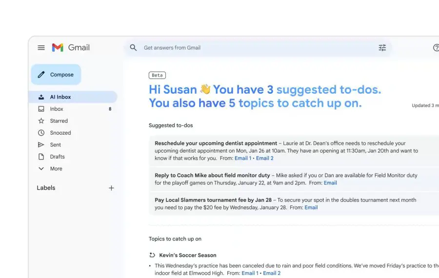 Pe lângă optimizarea căutării, Google abordează problema aglomerării vizuale prin conceptul AI Inbox. Aceasta este o nouă vizualizare a inbox-ului, care funcționează în paralel cu filele tradiționale precum Primary sau Promotions. AI Inbox acționează ca un secretar personal, scanând mesajele primite pentru a identifica prioritățile și sarcinile urgente. În loc de o listă cronologică de subiecte, utilizatorii vor vedea „brief-uri” sau rezumate ale celor mai importante acțiuni, cum ar fi o programare la dentist sau orarul meciurilor de fotbal ale copiilor, permițându-le să rămână organizați fără a parcurge manual fiecare email.