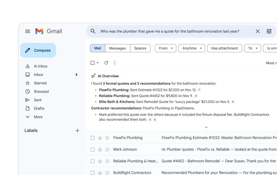 Cea mai vizibilă schimbare este introducerea funcției AI Overviews, pe care o știm deja din Google Search, direct în Gmail. Aceasta transformă bara de căutare clasică într-un asistent conversațional capabil să extragă și să sintetizeze informații disparate din multiple emailuri. Utilizatorii nu mai sunt nevoiți să deschidă mesajele unul câte unul pentru a găsi detalii specifice. De exemplu, o simplă întrebare precum „Care este statusul comenzii mele?” va genera un răspuns complet care include numărul de urmărire, data estimată de livrare și articolele comandate, chiar dacă aceste informații sunt răspândite în mai multe notificări de la diferiți expeditori.