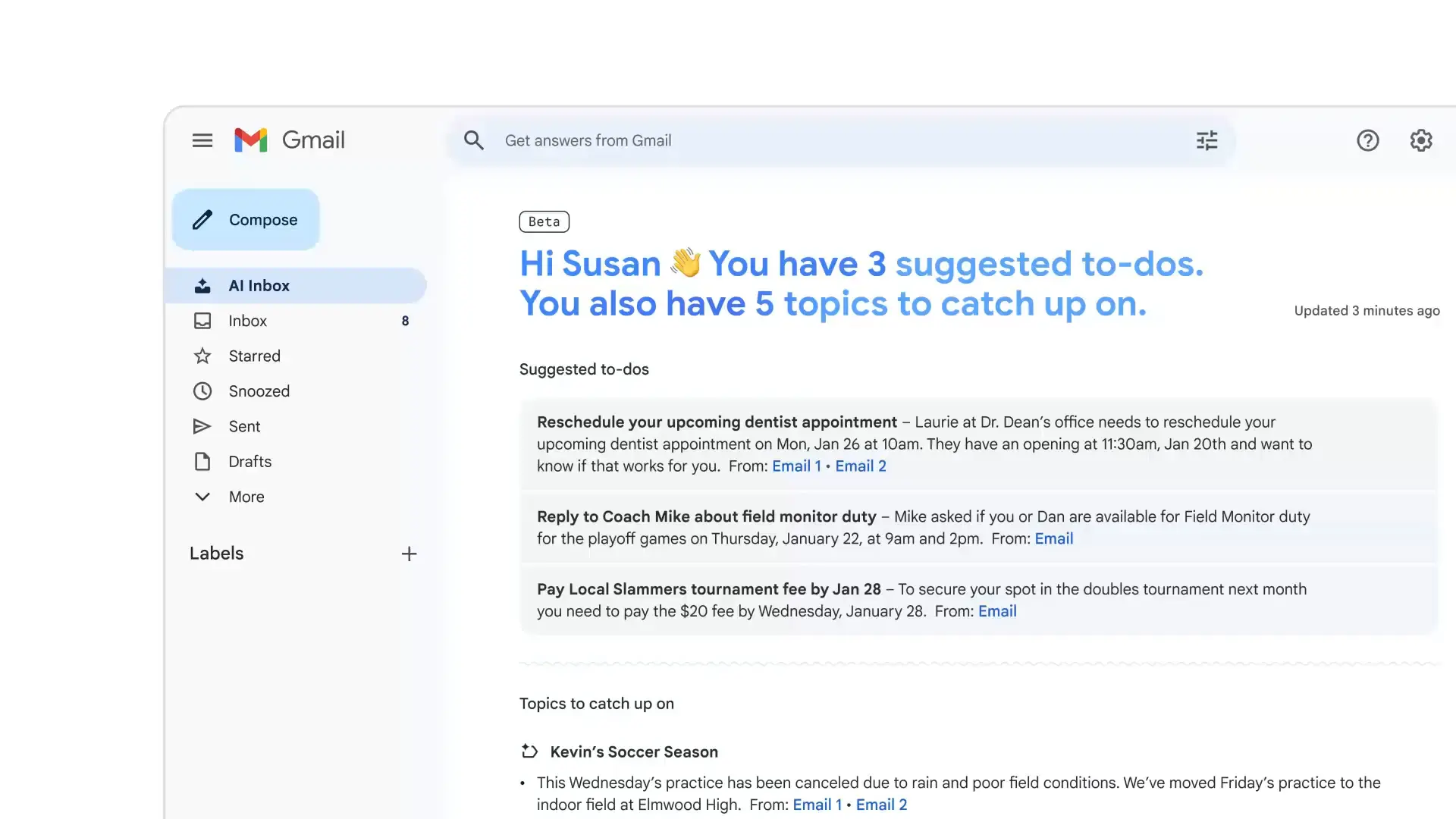 Pe lângă optimizarea căutării, Google abordează problema aglomerării vizuale prin conceptul AI Inbox. Aceasta este o nouă vizualizare a inbox-ului, care funcționează în paralel cu filele tradiționale precum Primary sau Promotions. AI Inbox acționează ca un secretar personal, scanând mesajele primite pentru a identifica prioritățile și sarcinile urgente. În loc de o listă cronologică de subiecte, utilizatorii vor vedea „brief-uri” sau rezumate ale celor mai importante acțiuni, cum ar fi o programare la dentist sau orarul meciurilor de fotbal ale copiilor, permițându-le să rămână organizați fără a parcurge manual fiecare email.