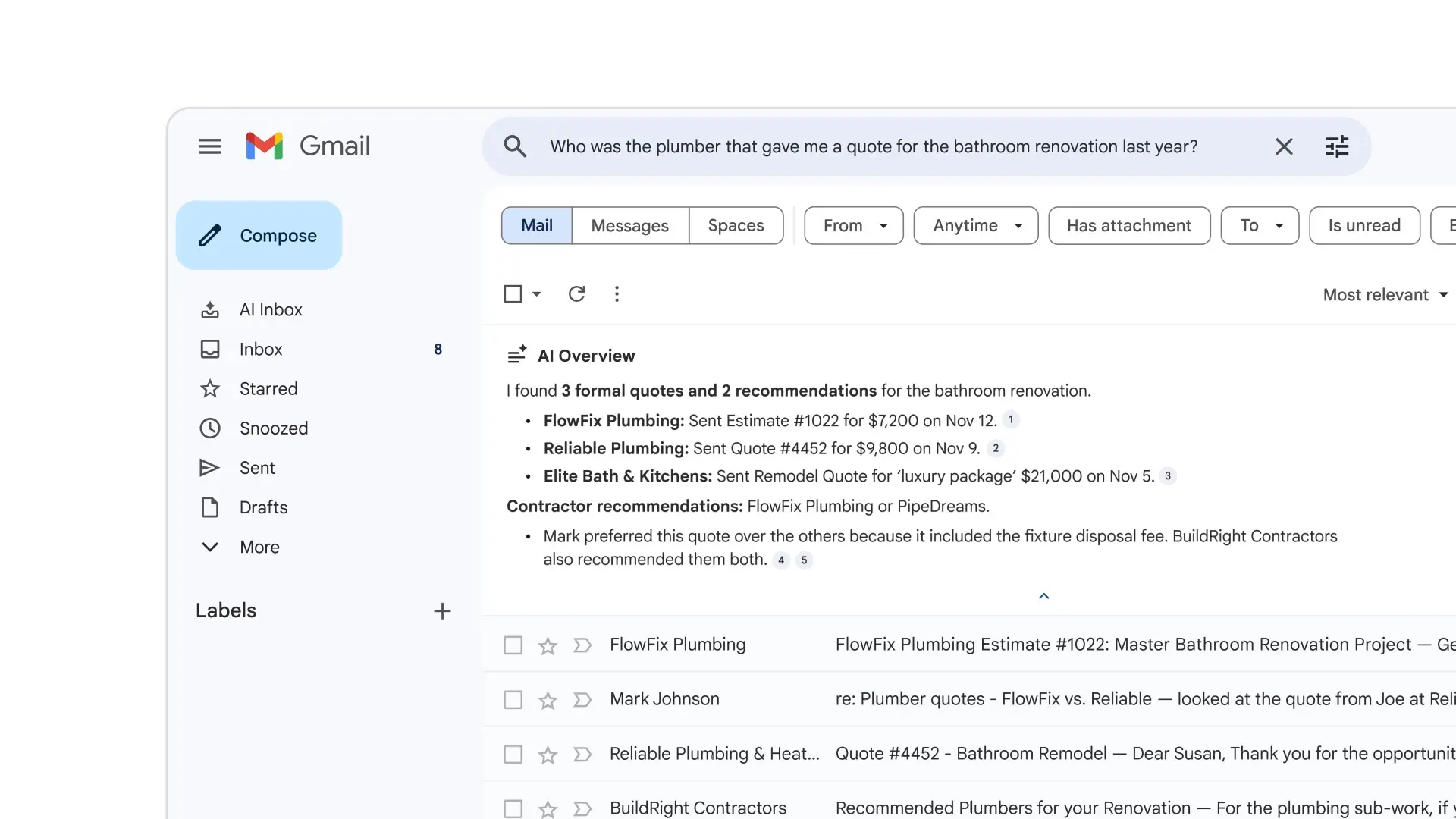 Cea mai vizibilă schimbare este introducerea funcției AI Overviews, pe care o știm deja din Google Search, direct în Gmail. Aceasta transformă bara de căutare clasică într-un asistent conversațional capabil să extragă și să sintetizeze informații disparate din multiple emailuri. Utilizatorii nu mai sunt nevoiți să deschidă mesajele unul câte unul pentru a găsi detalii specifice. De exemplu, o simplă întrebare precum „Care este statusul comenzii mele?” va genera un răspuns complet care include numărul de urmărire, data estimată de livrare și articolele comandate, chiar dacă aceste informații sunt răspândite în mai multe notificări de la diferiți expeditori.