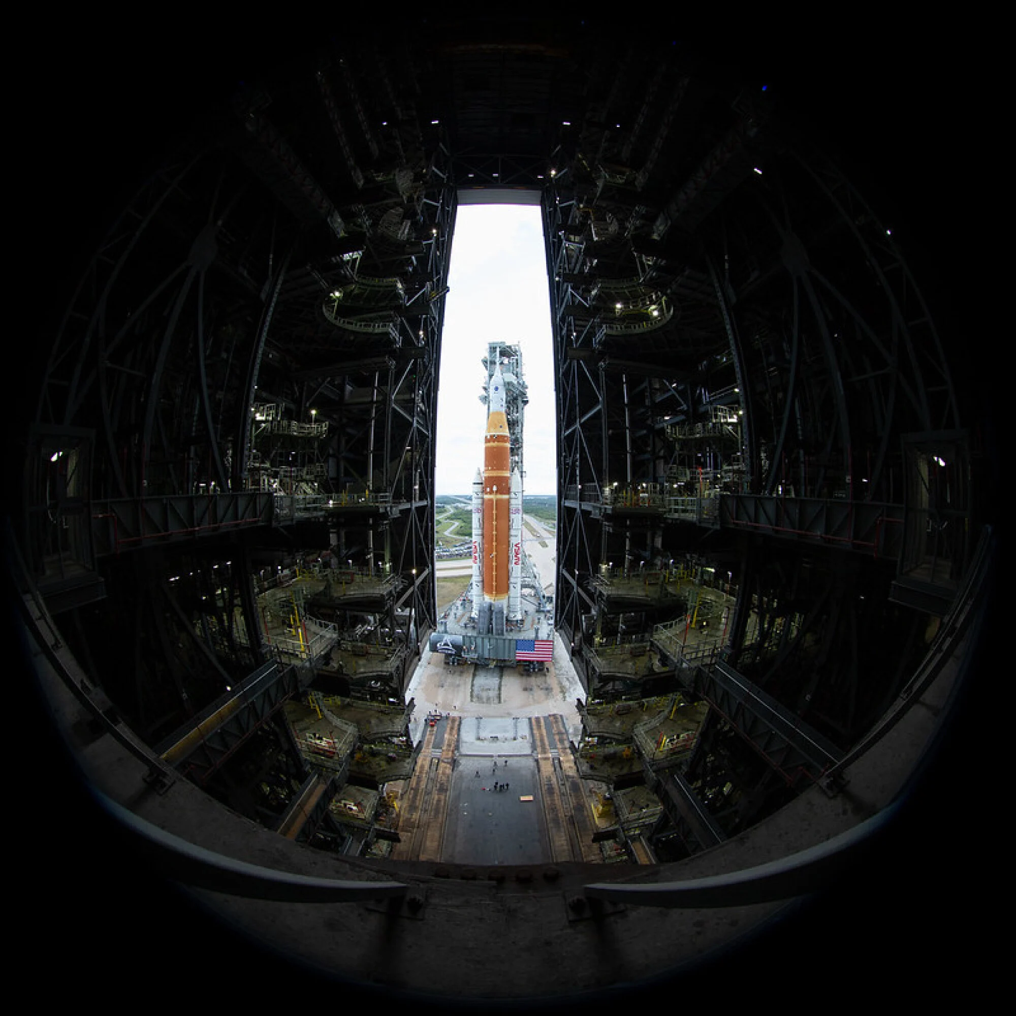 Agenția spațială americană a pregătit sistemul de lansare spațială și lansatorul mobil, care împreună cântăresc 5000 de tone, către rampa de lansare din Cape Canaveral, Florida. Procesiunea lentă a sistemului care include și nava spațială Orion a durat 12 ore, fiind folosit un transportor cu șenile de generație mai veche.