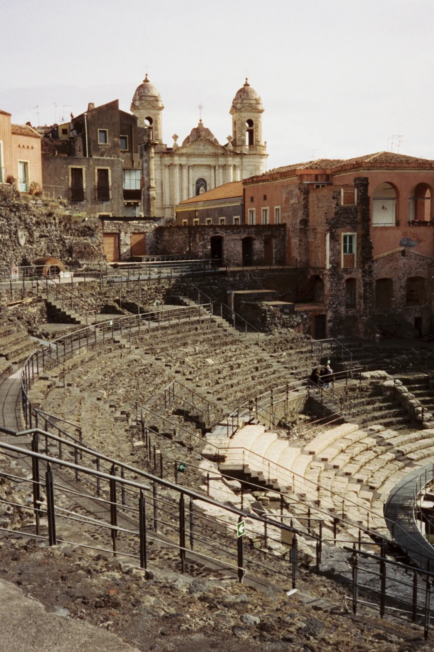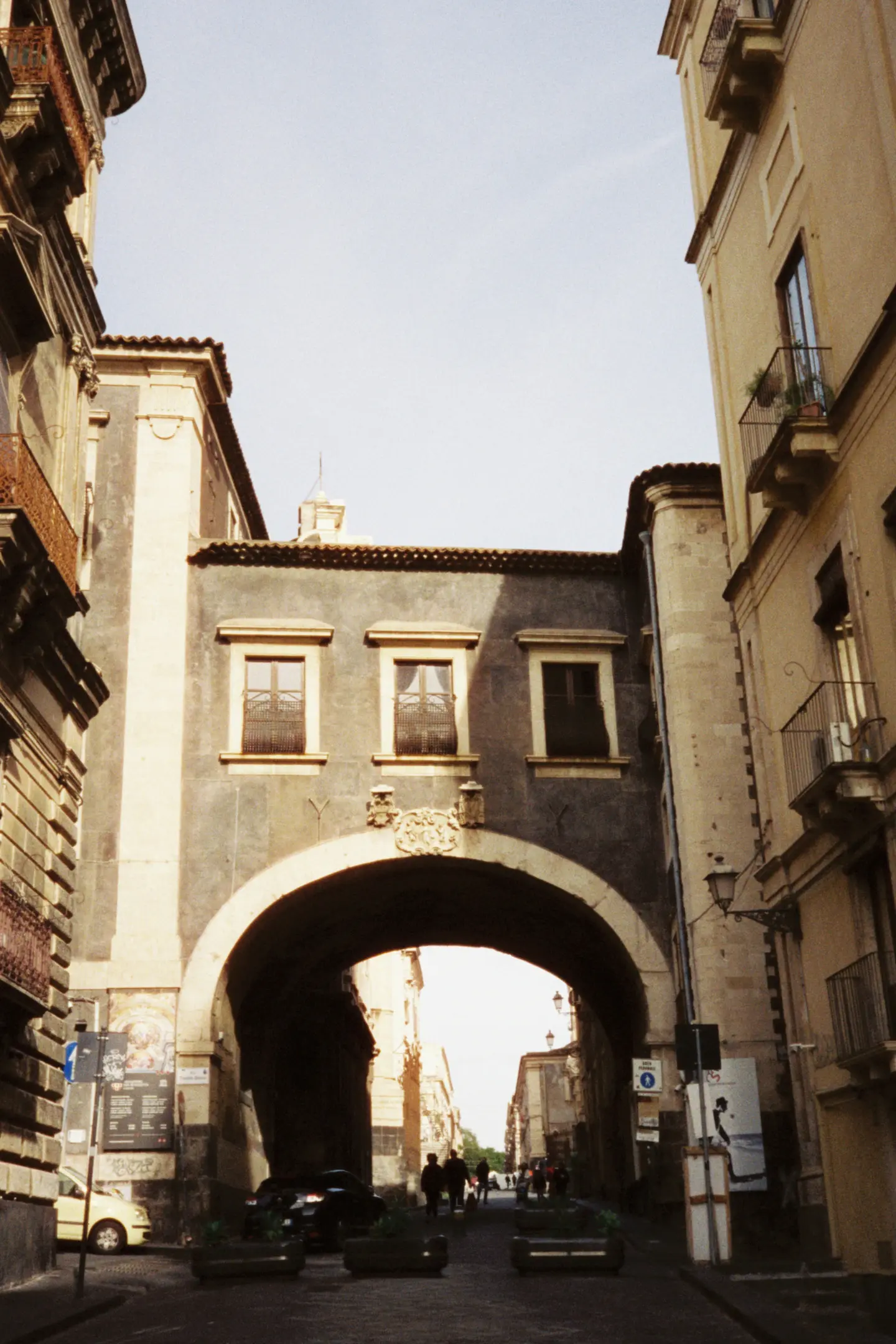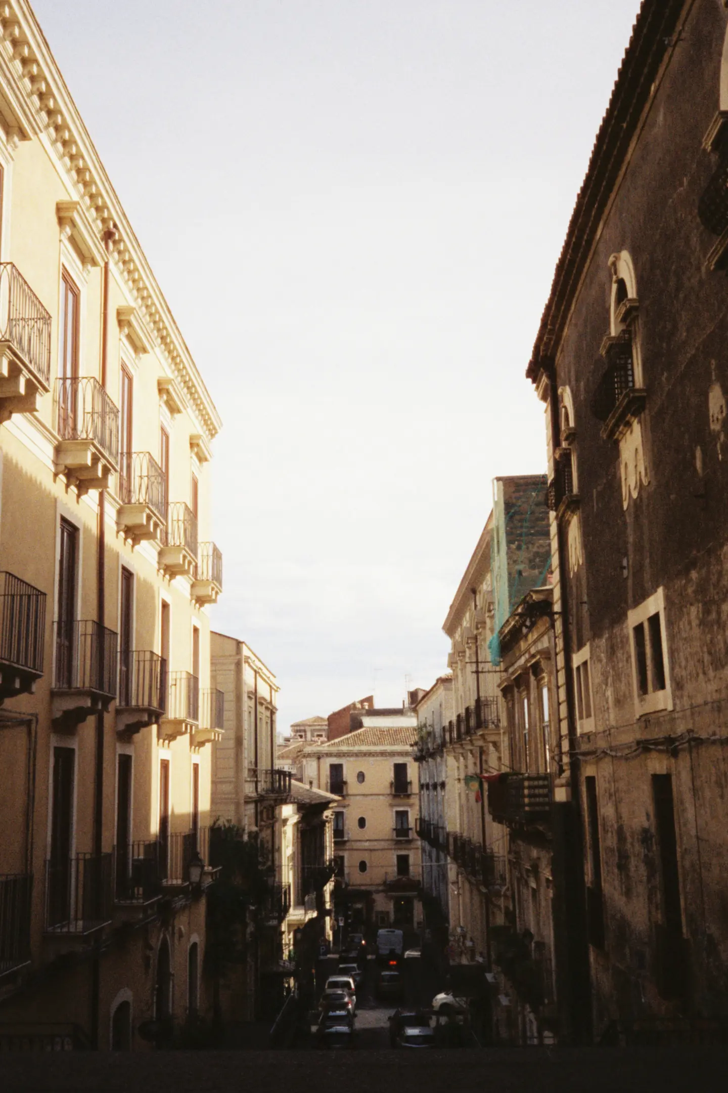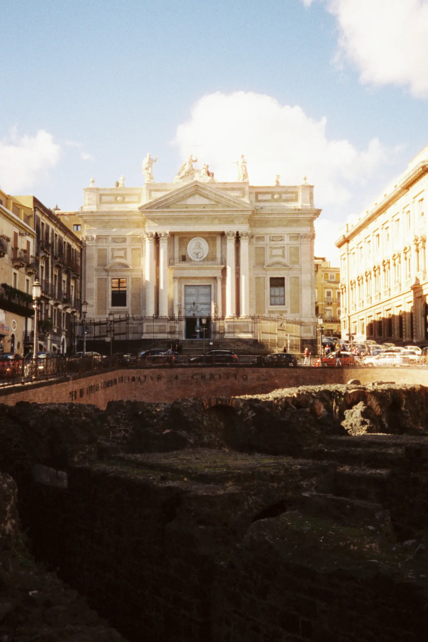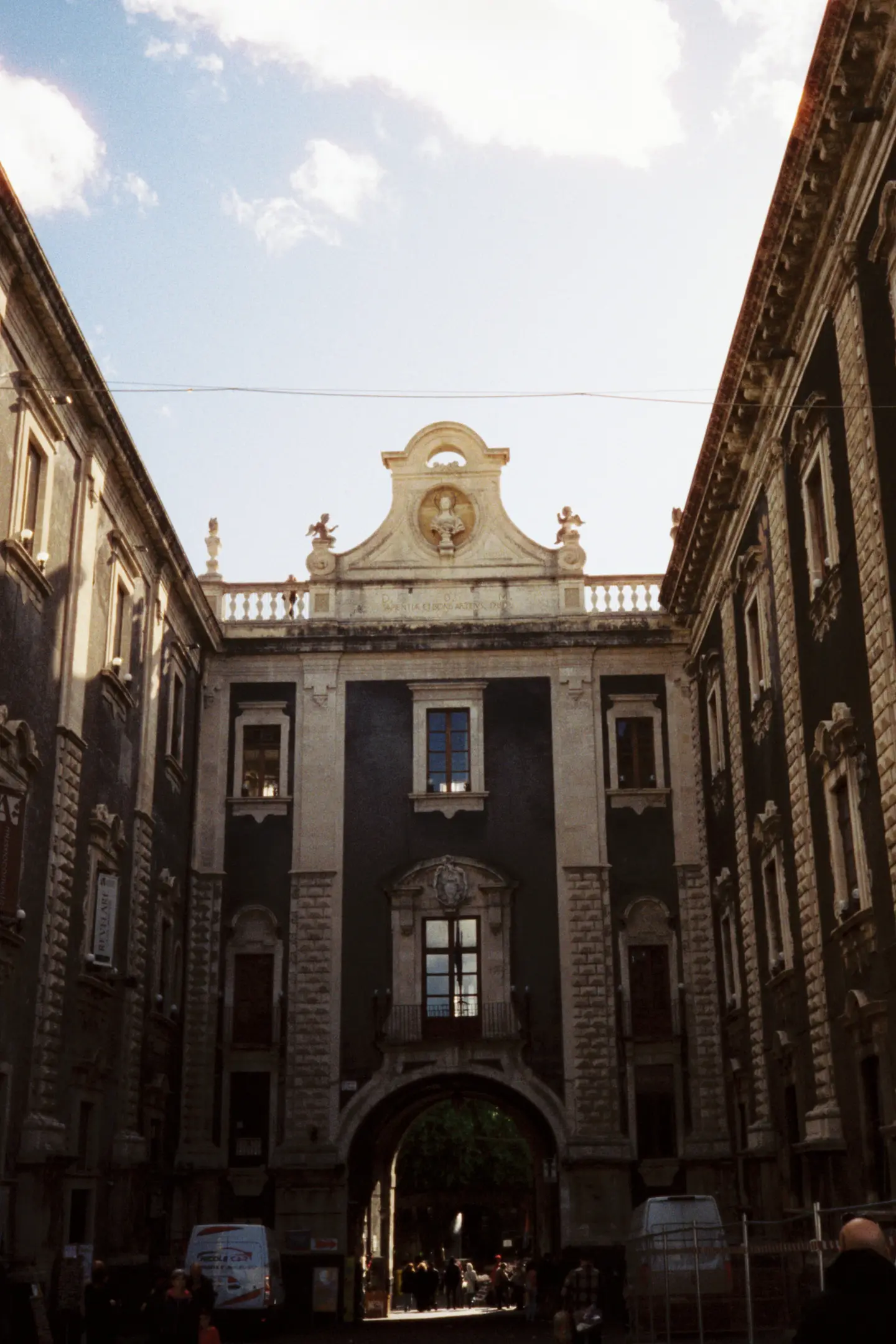 Ca să-ți oferim un pic de context, de ce am ales tocmai Catania pentru aventura asta? Ei bine, pentru că e genul ăla de oraș care nu încearcă să fie frumos. Catania e o lecție dură despre textură. E autentic până în măduva oaselor. Totul în jur e construit din piatră vulcanică neagră, smulsă direct din măruntaiele Etnei. Bazaltul întunecat domină arhitectura barocă și creează un contrast vizual incredibil, aproape violent, cu lumina albă, arzătoare, specific mediteraneană. Umbrele sunt grele, adânci, iar soarele de amiază decupează formele cu o precizie chirurgicală. Iar filmul? Filmul iubește drama acestui contrast.