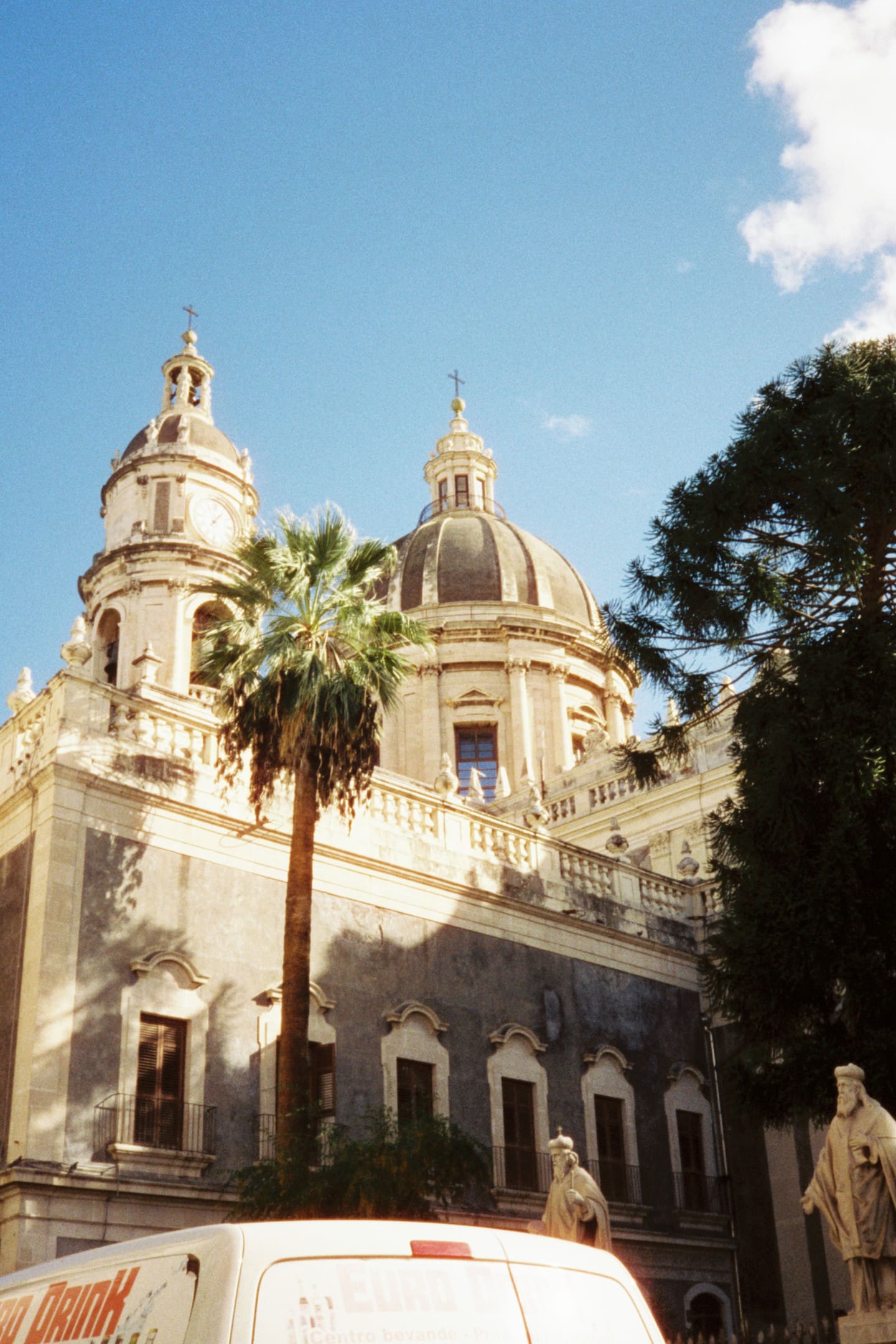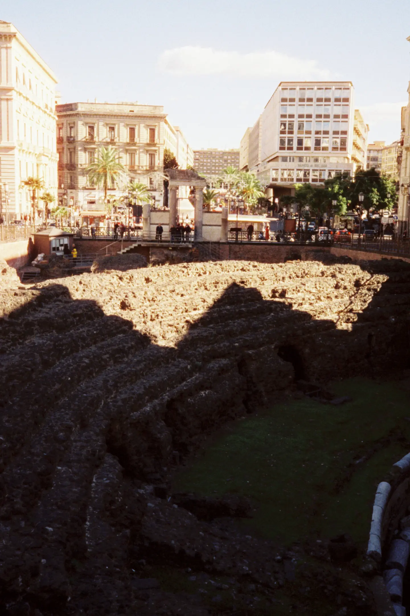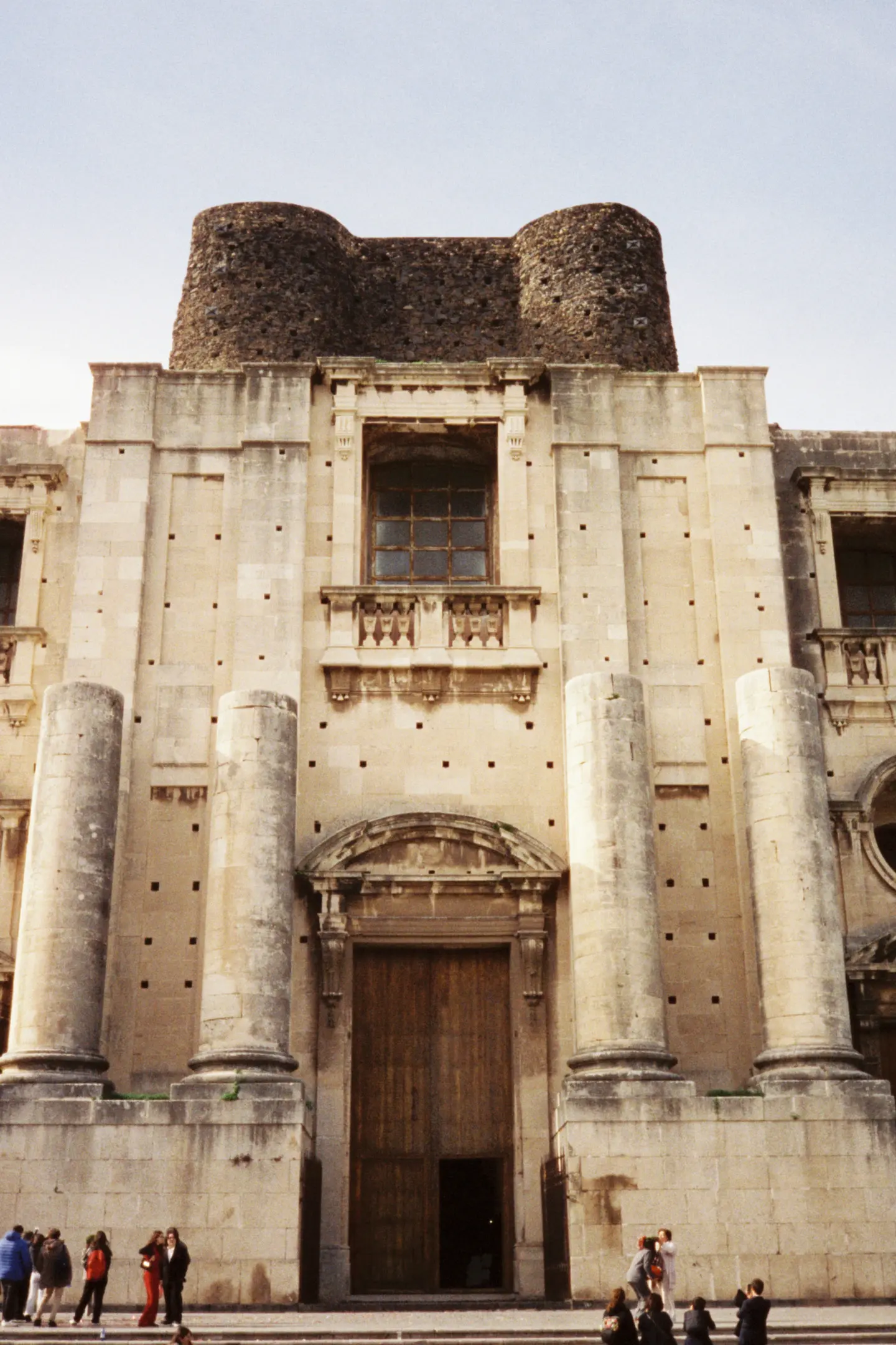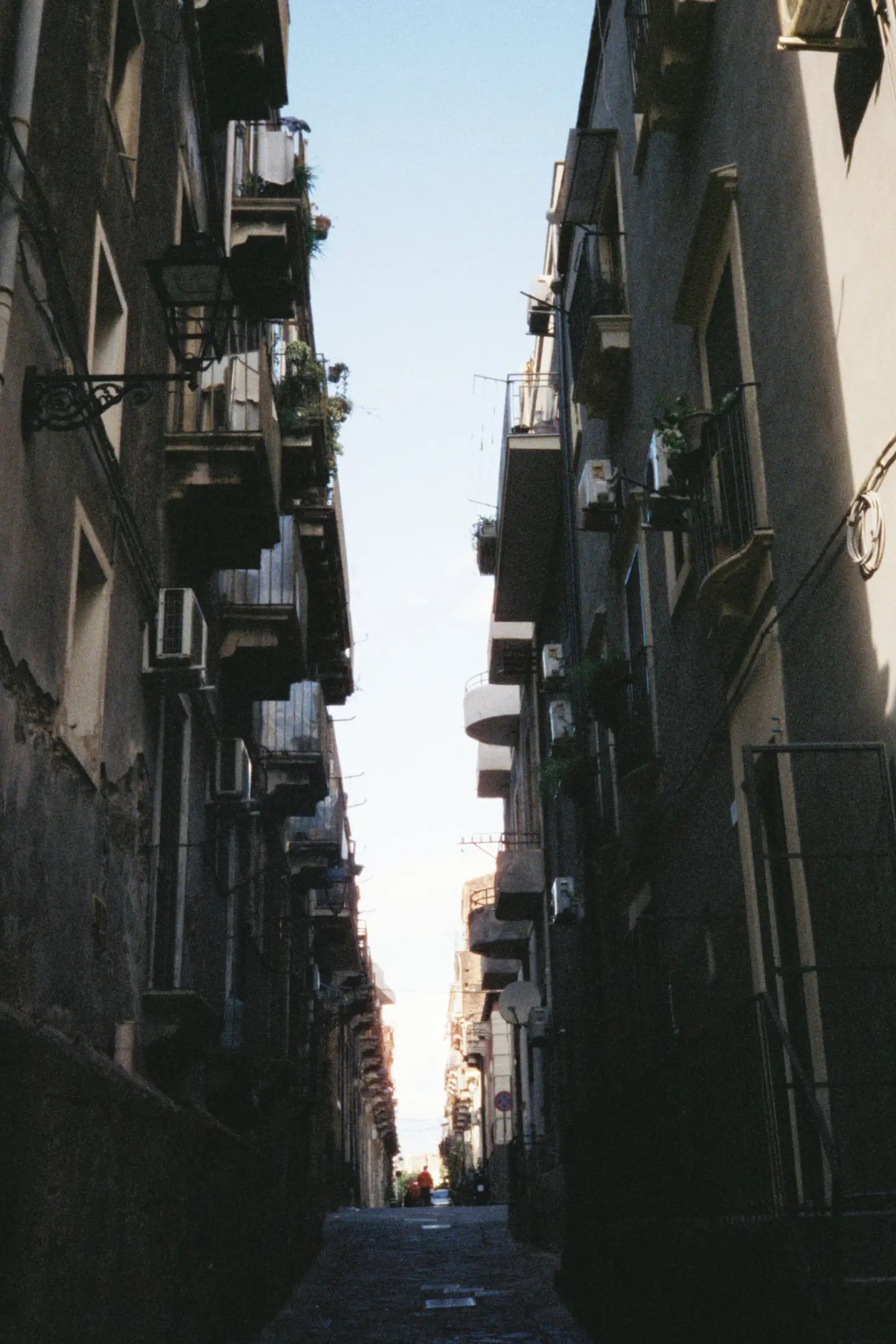 Ca să-ți oferim un pic de context, de ce am ales tocmai Catania pentru aventura asta? Ei bine, pentru că e genul ăla de oraș care nu încearcă să fie frumos. Catania e o lecție dură despre textură. E autentic până în măduva oaselor. Totul în jur e construit din piatră vulcanică neagră, smulsă direct din măruntaiele Etnei. Bazaltul întunecat domină arhitectura barocă și creează un contrast vizual incredibil, aproape violent, cu lumina albă, arzătoare, specific mediteraneană. Umbrele sunt grele, adânci, iar soarele de amiază decupează formele cu o precizie chirurgicală. Iar filmul? Filmul iubește drama acestui contrast.